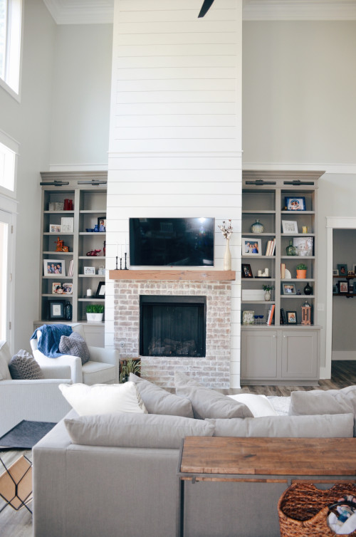 Tall White Shiplap Fireplace with Brick Surround and Built-Ins
