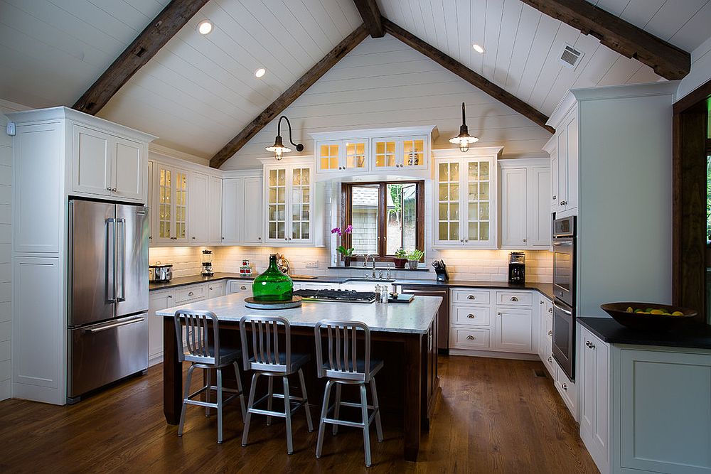 This style is all about balance and creating a warm atmosphere that you just want to curl up in. Think exposed wooden beams, distressed cabinet doors, and even antique dish racks for that timeless feel.