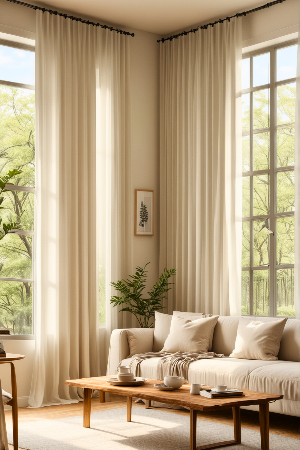 Choose sheer curtains that softly filter light without completely obscuring it. Instead, select basic roller shades that can be lowered for privacy but vanish when retracted.