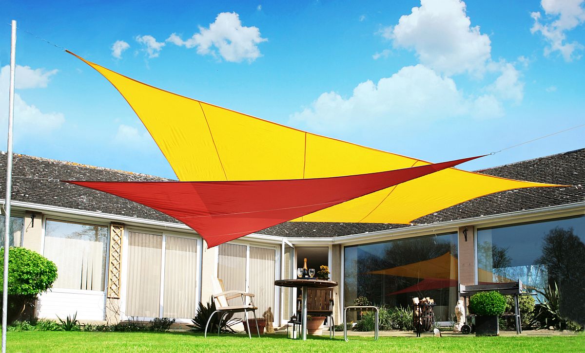 A gorgeous and vibrant use of sails to provide backyard shade.