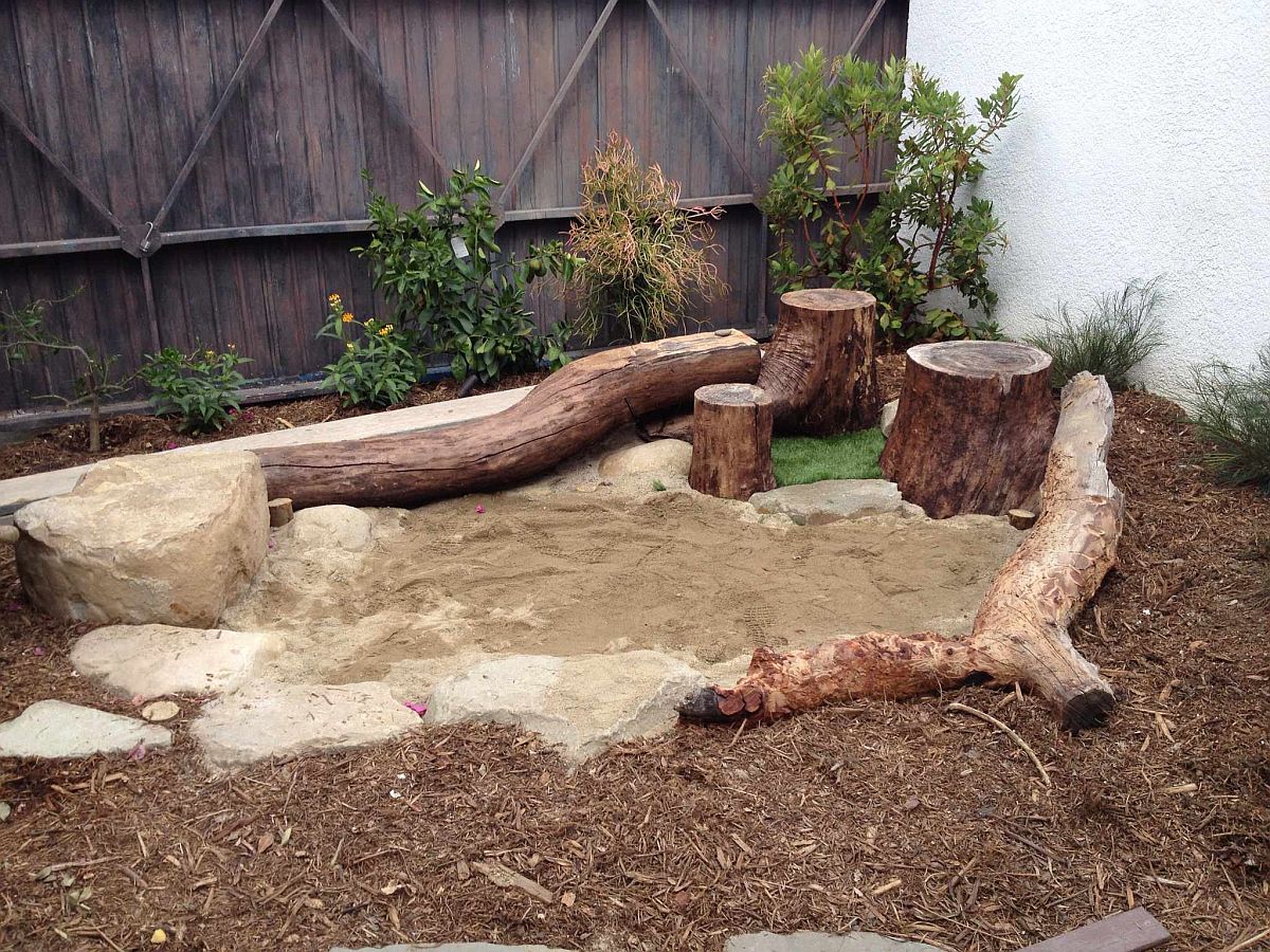 A rustic backyard play zone with a sandbox framed by tree trunks and wooden logs. [From: Stout Design-Build]