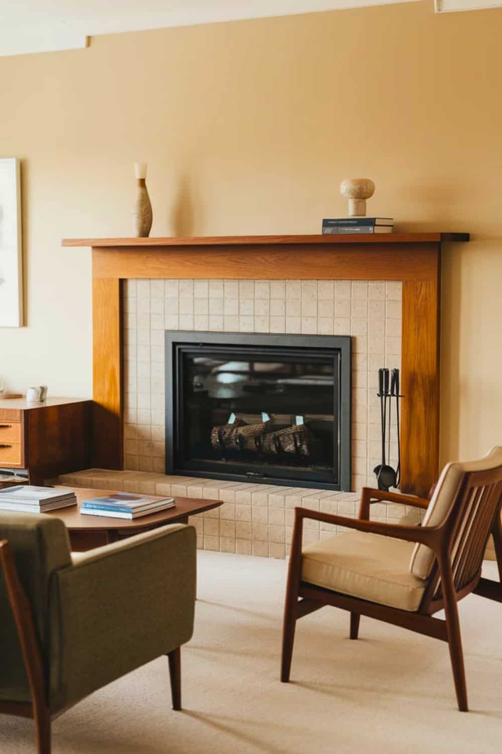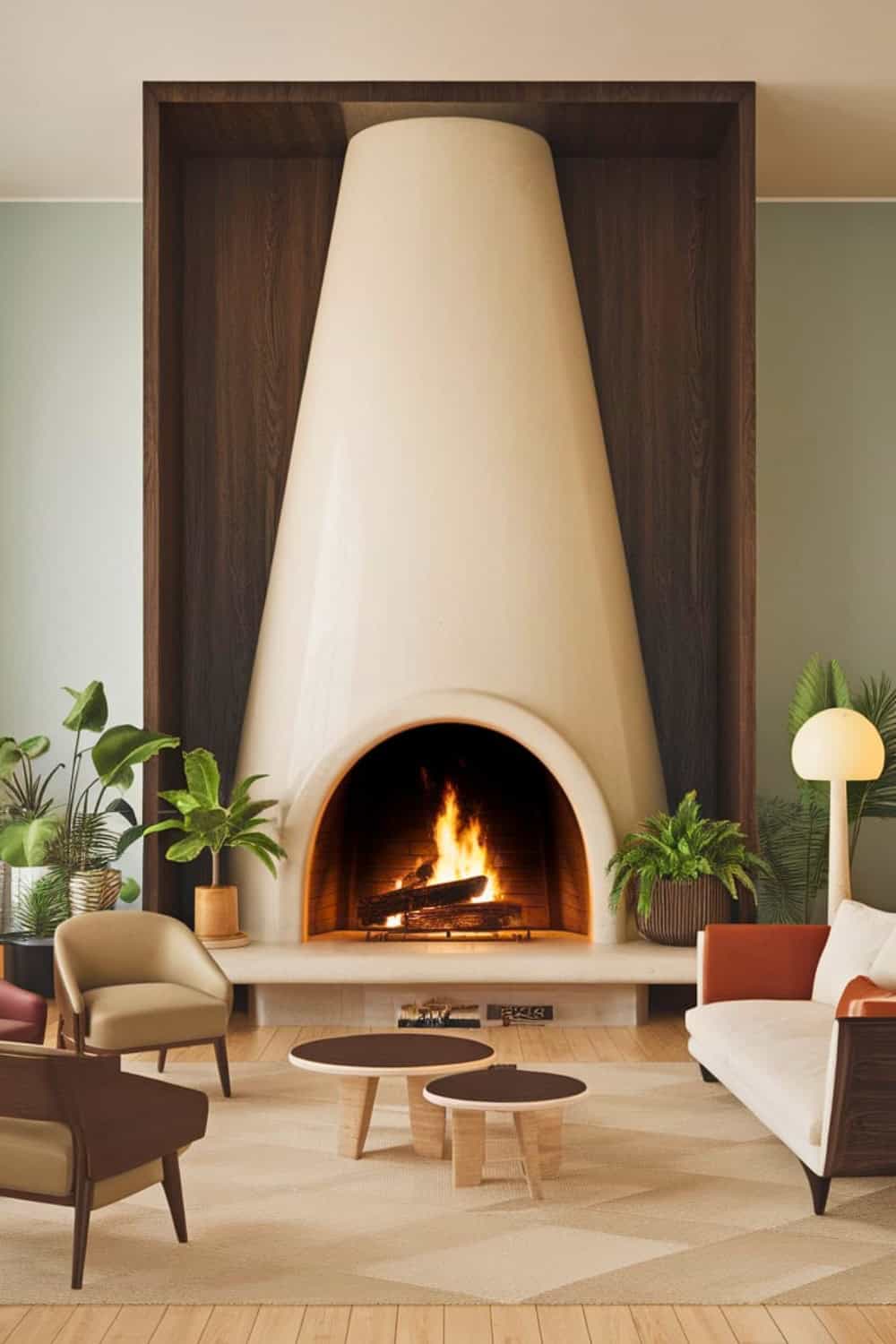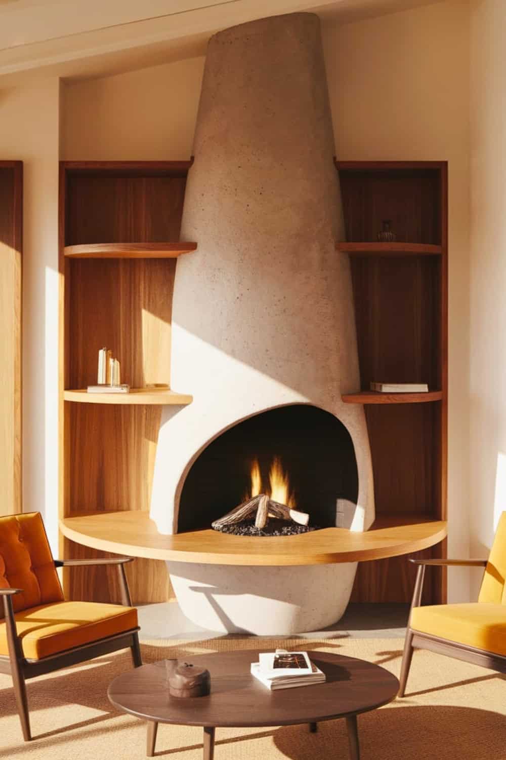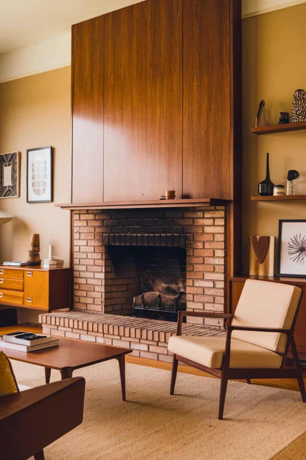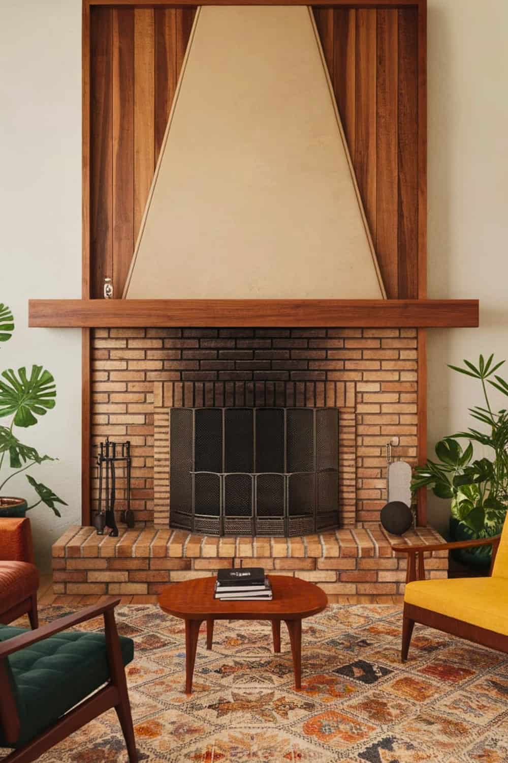 Pairing it with earthy tones and minimal furniture enhances that retro aesthetic. Adding soft lighting or wall sconces really emphasizes the architectural drama of this striking fireplace.