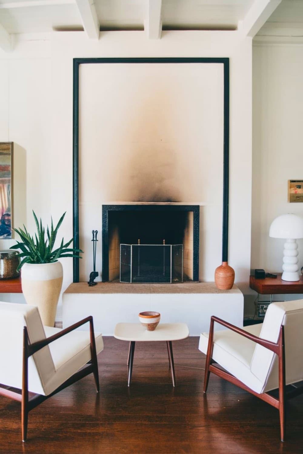 It truly turns the fireplace into a timeless statement piece in a midcentury modern setting.