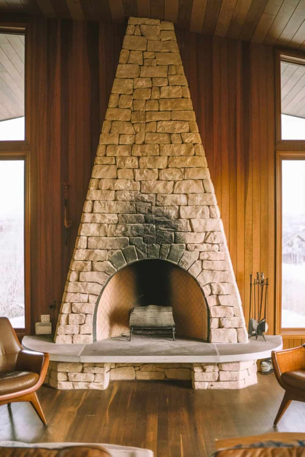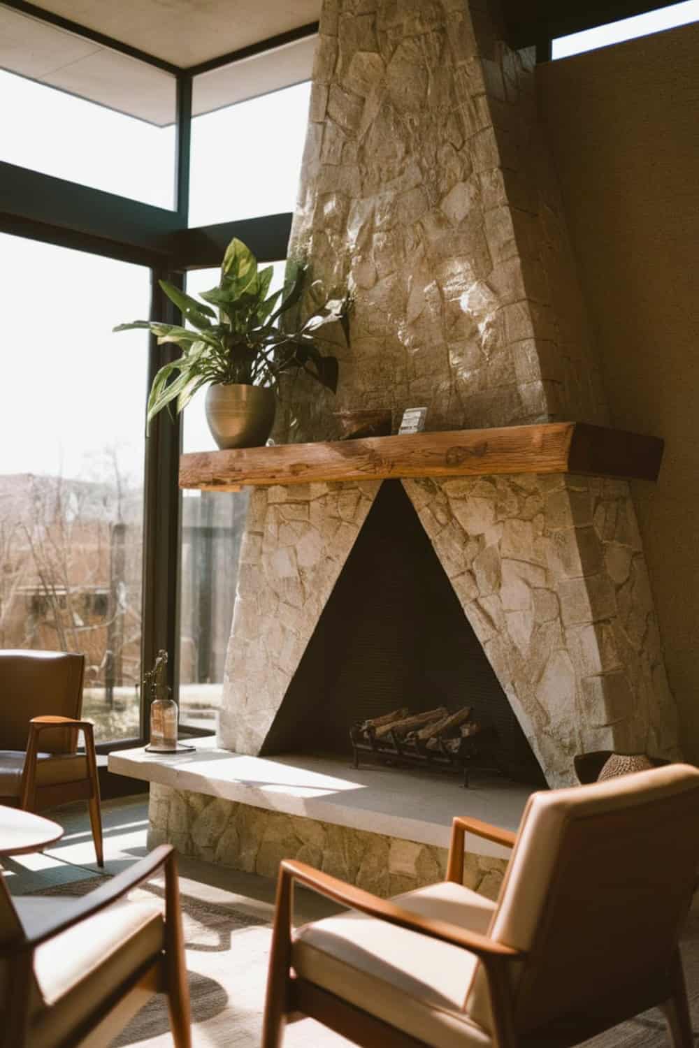 A grand stone fireplace with a pyramid shaped structure commands this space. It beautifully blends midcentury modern aesthetics with a touch of rustic charm.