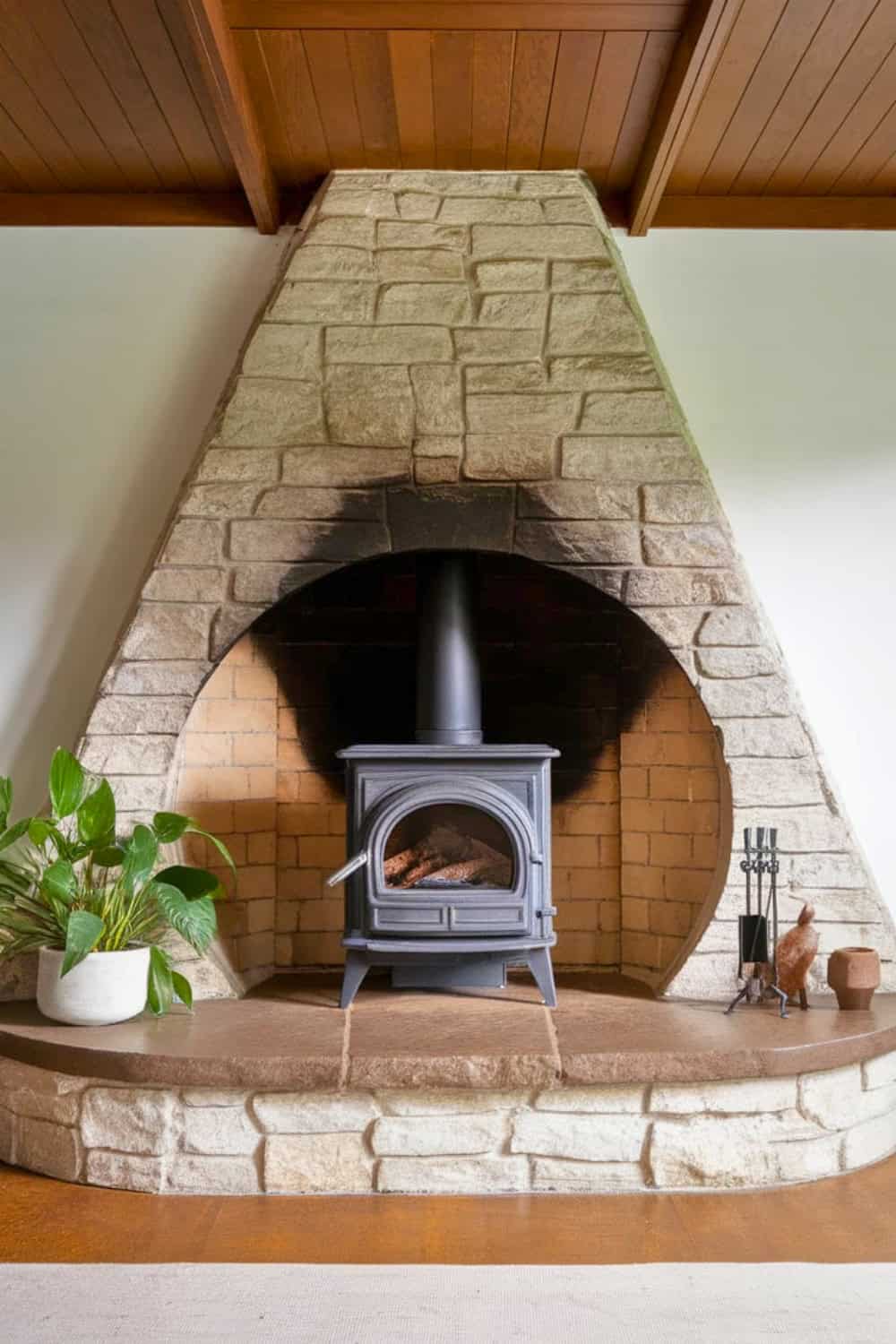 A grand arched fireplace, complete with a textured stone surround, truly creates a bold midcentury statement. The stove insert adds a touch of modern efficiency while still keeping the fireplace’s classic appeal.