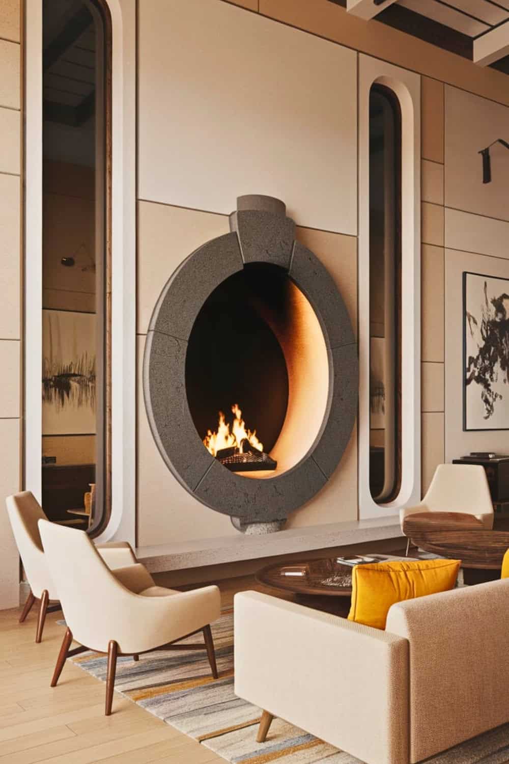 This bold circular fireplace, encased in concrete and stone, gives the space such a futuristic yet midcentury vibe. Its deep set firebox really enhances its sculptural appeal, making it a true statement piece.