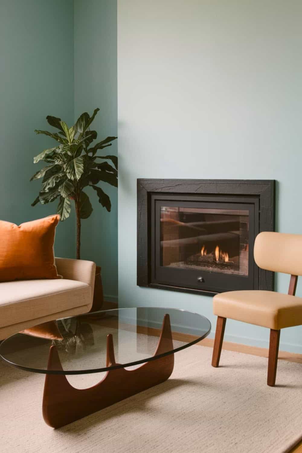 A metal framed fire screen introduces a functional yet stylish touch, ensuring safety without sacrificing design cohesion. Pairing this with simple furniture and plants brings out the timeless appeal of midcentury modern simplicity.