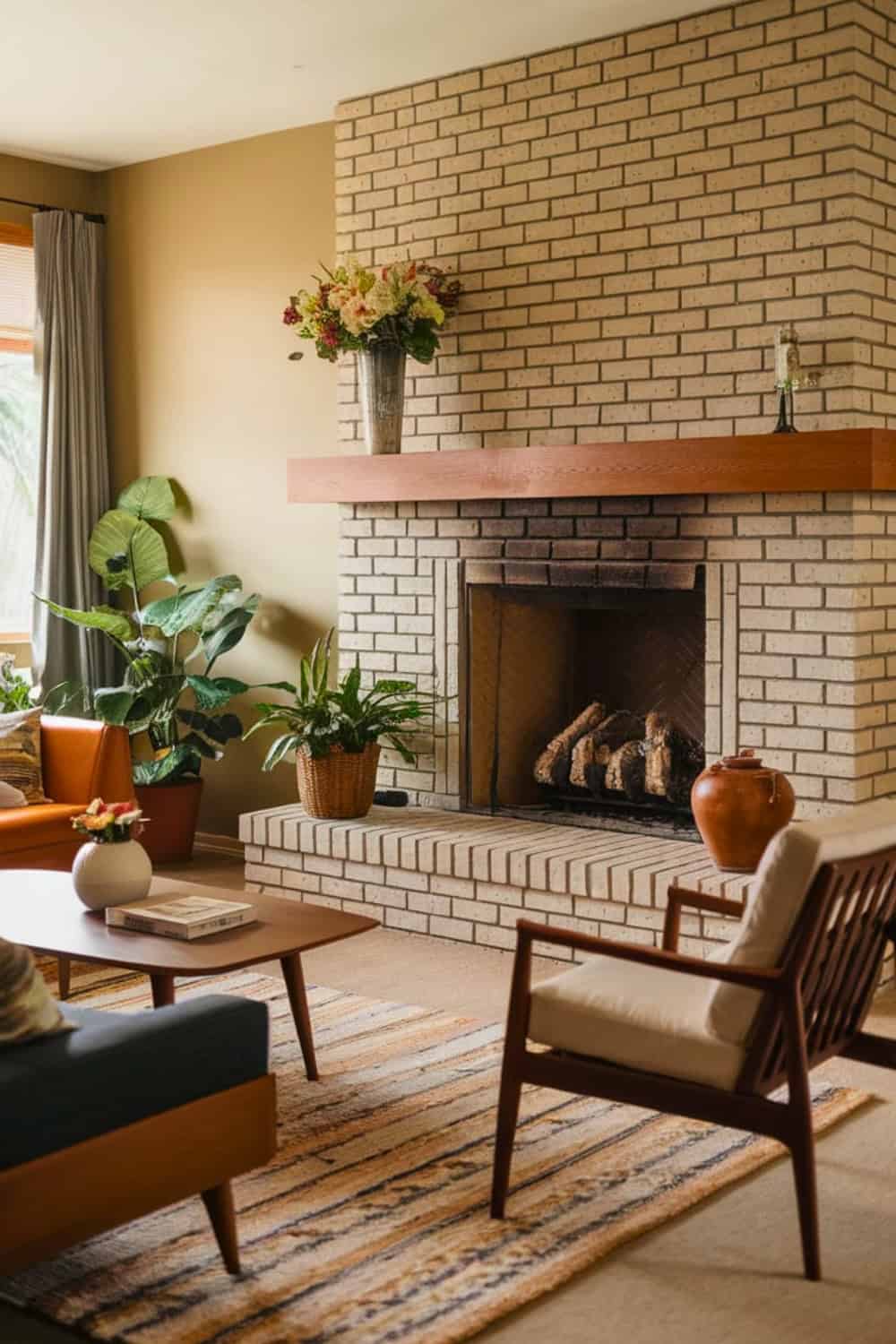 This stacked brick fireplace, featuring neutral tones, creates a warm, inviting focal point that perfectly embodies midcentury style. The floating wood mantel adds a sleek contrast.