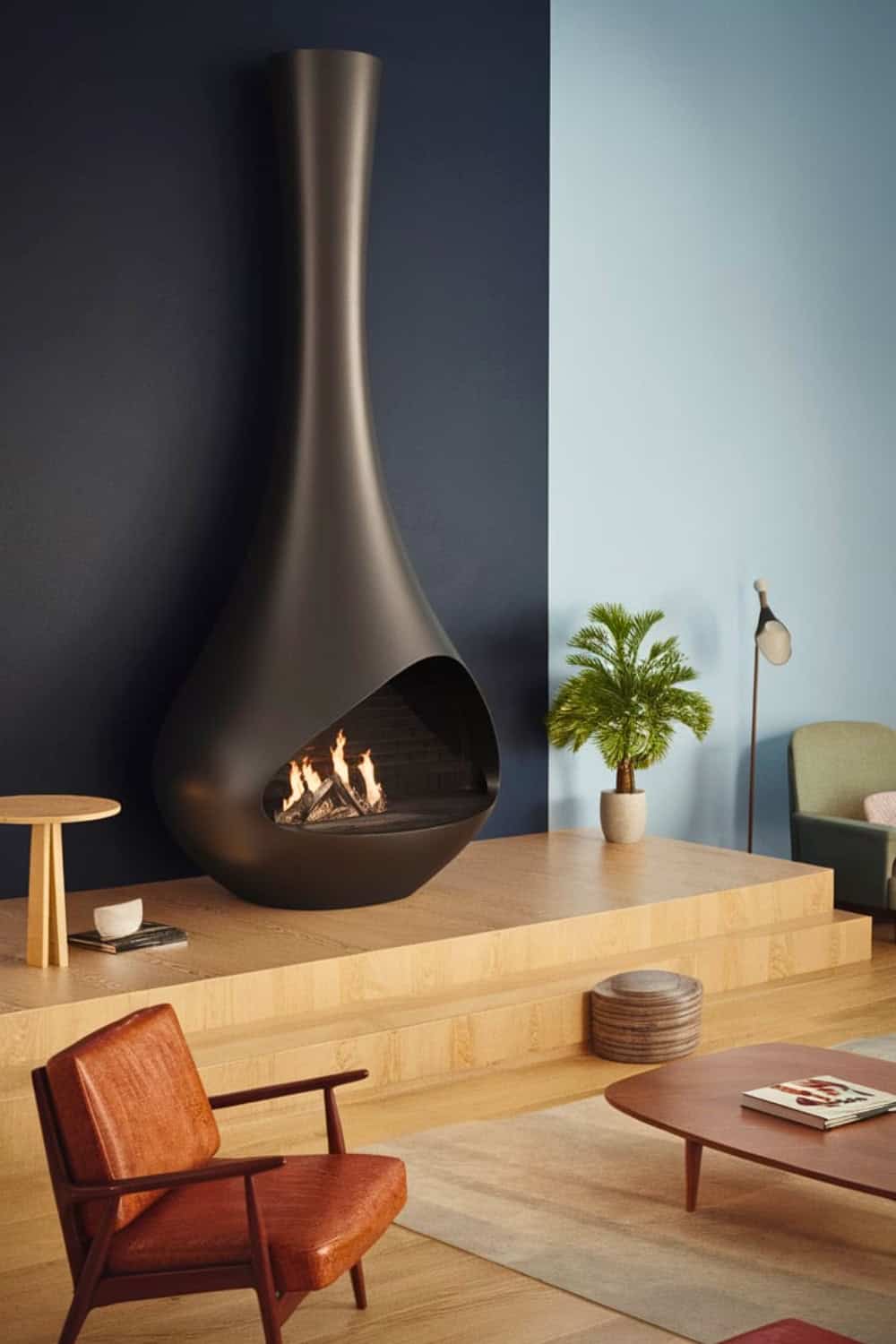 A sleek, sculptural fireplace with a fluid teardrop shape makes such an ultra modern statement while still staying true to midcentury aesthetics. The matte black finish offers a beautiful contrast against the two toned walls, really enhancing its presence.