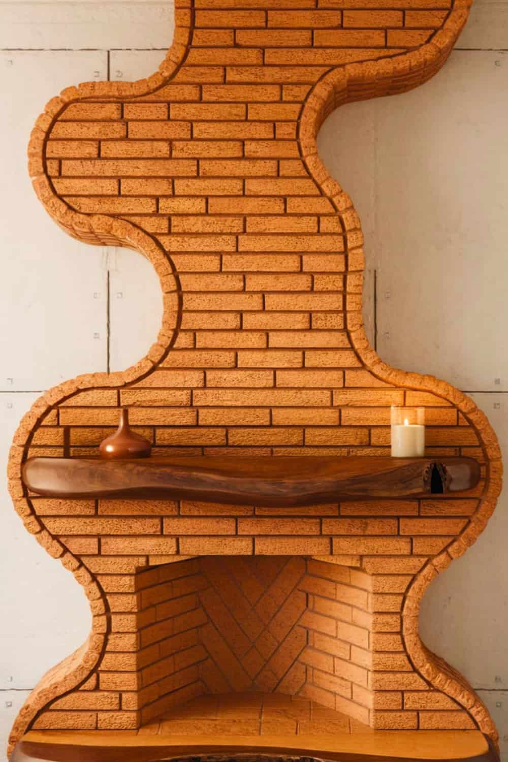 A live edge wooden mantel enhances the organic feel, adding a natural contrast to the geometric brick pattern. Keeping the decor minimal ensures the unique fireplace design remains the star.