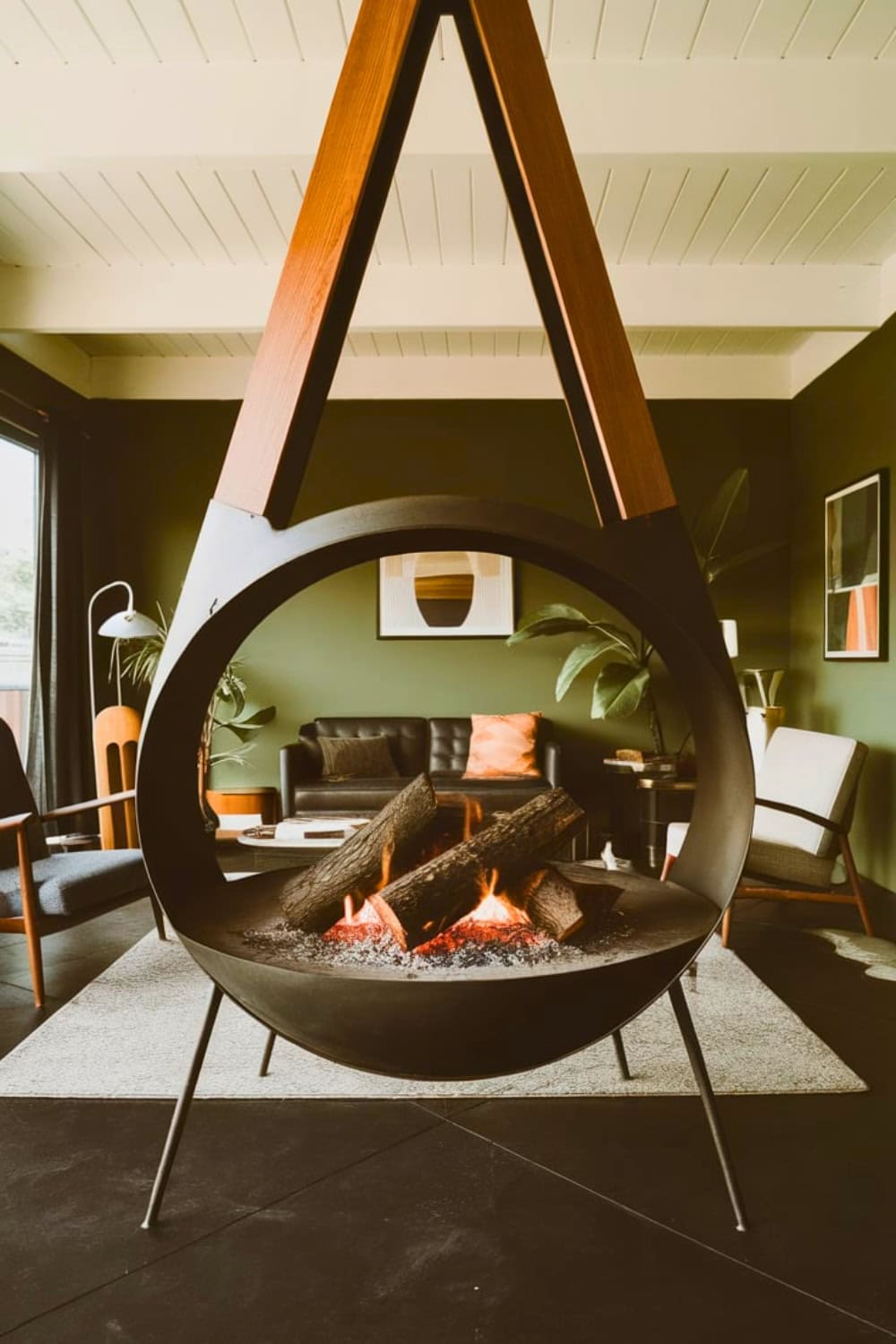This breathtaking suspended fireplace is a total showstopper in a midcentury modern living space. It beautifully blends geometric artistry with cozy warmth.