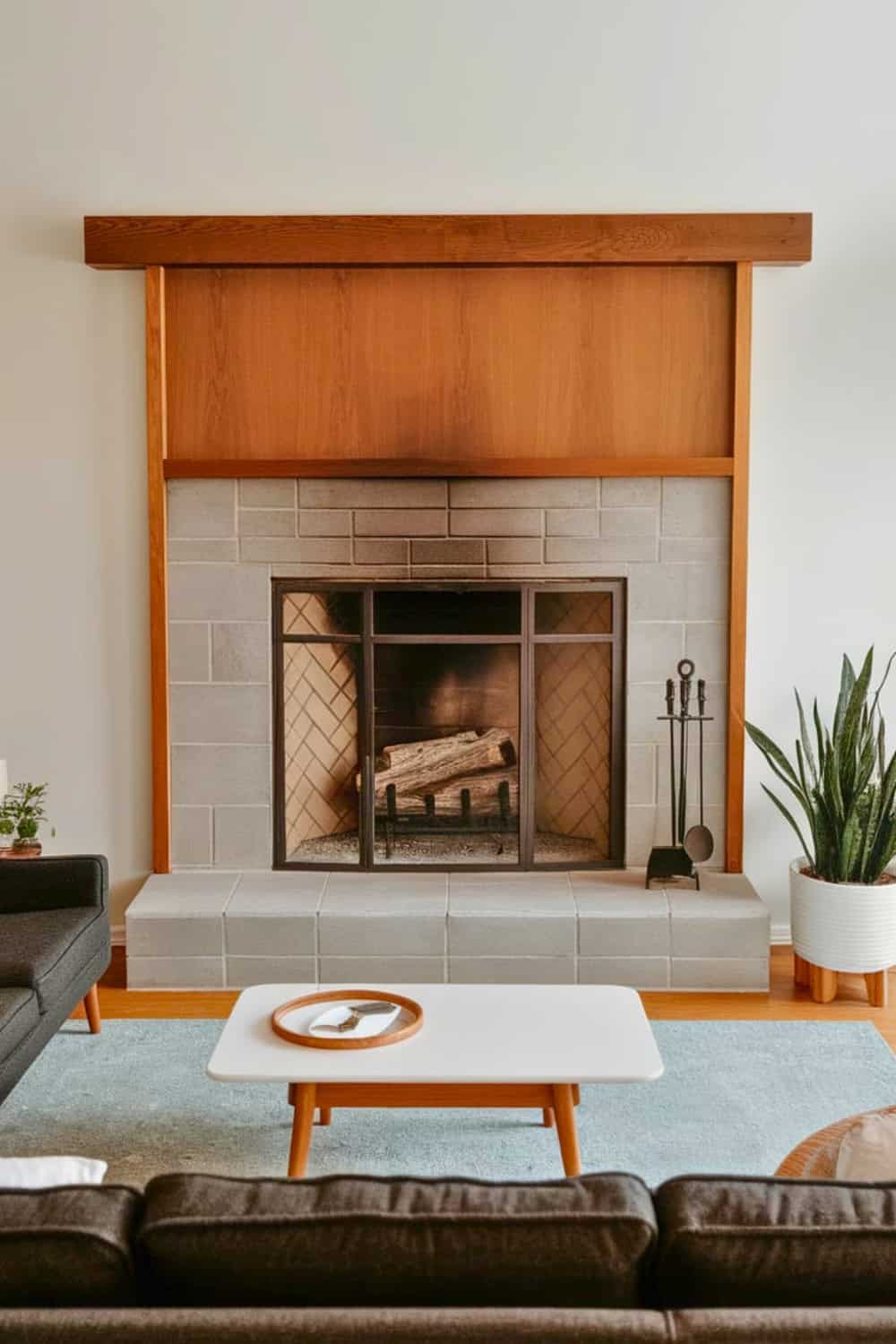 It truly grounds the entire fireplace structure in its place. When you combine earthy wood shades with straightforward furniture, it highlights the crisp forms and natural coziness that defines midcentury designs.