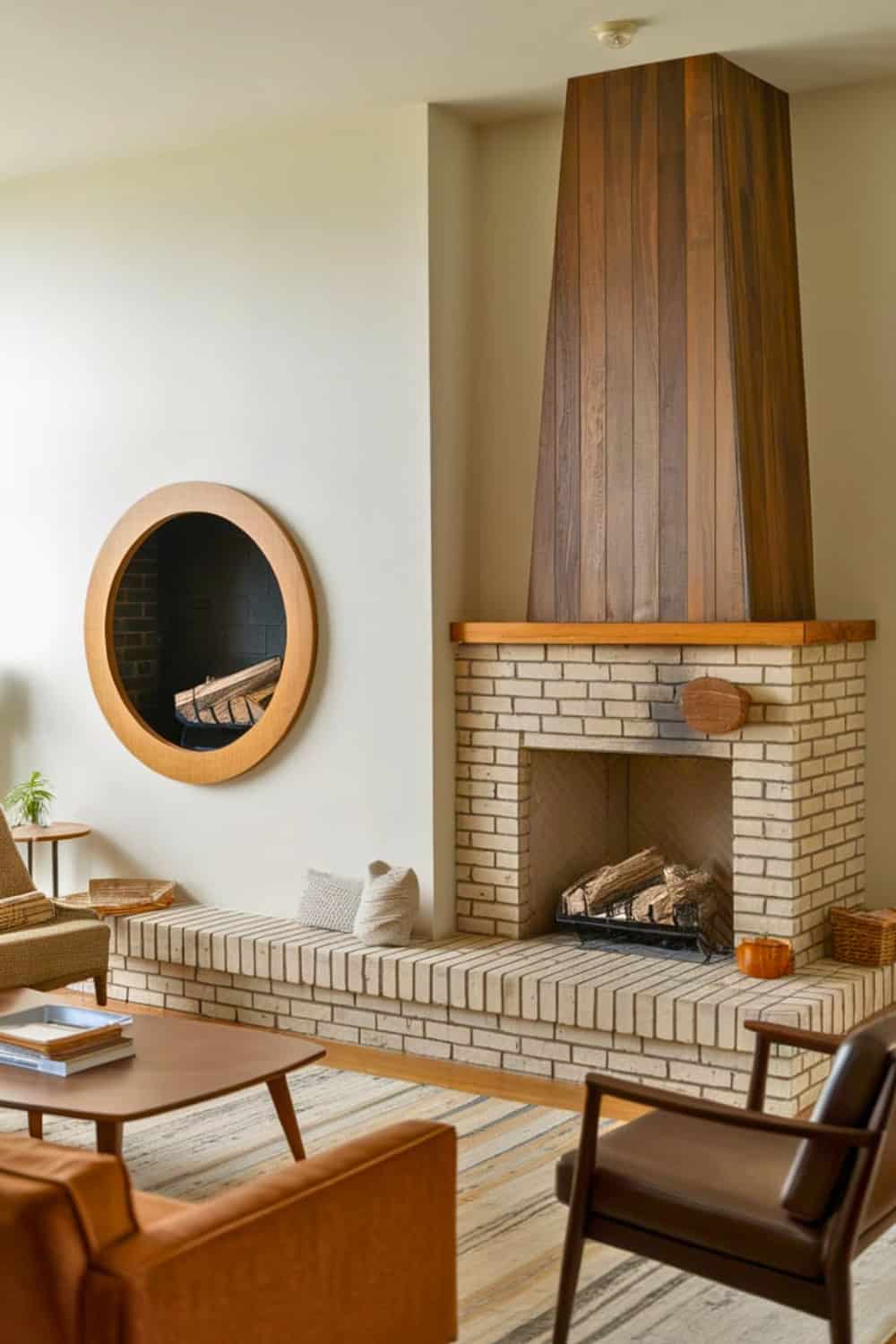 A striking brick fireplace here is paired with a circular wall cutout, creating such a visually balanced focal point in this midcentury modern living space. The angled, wood-paneled chimney really adds a vertical dimension.