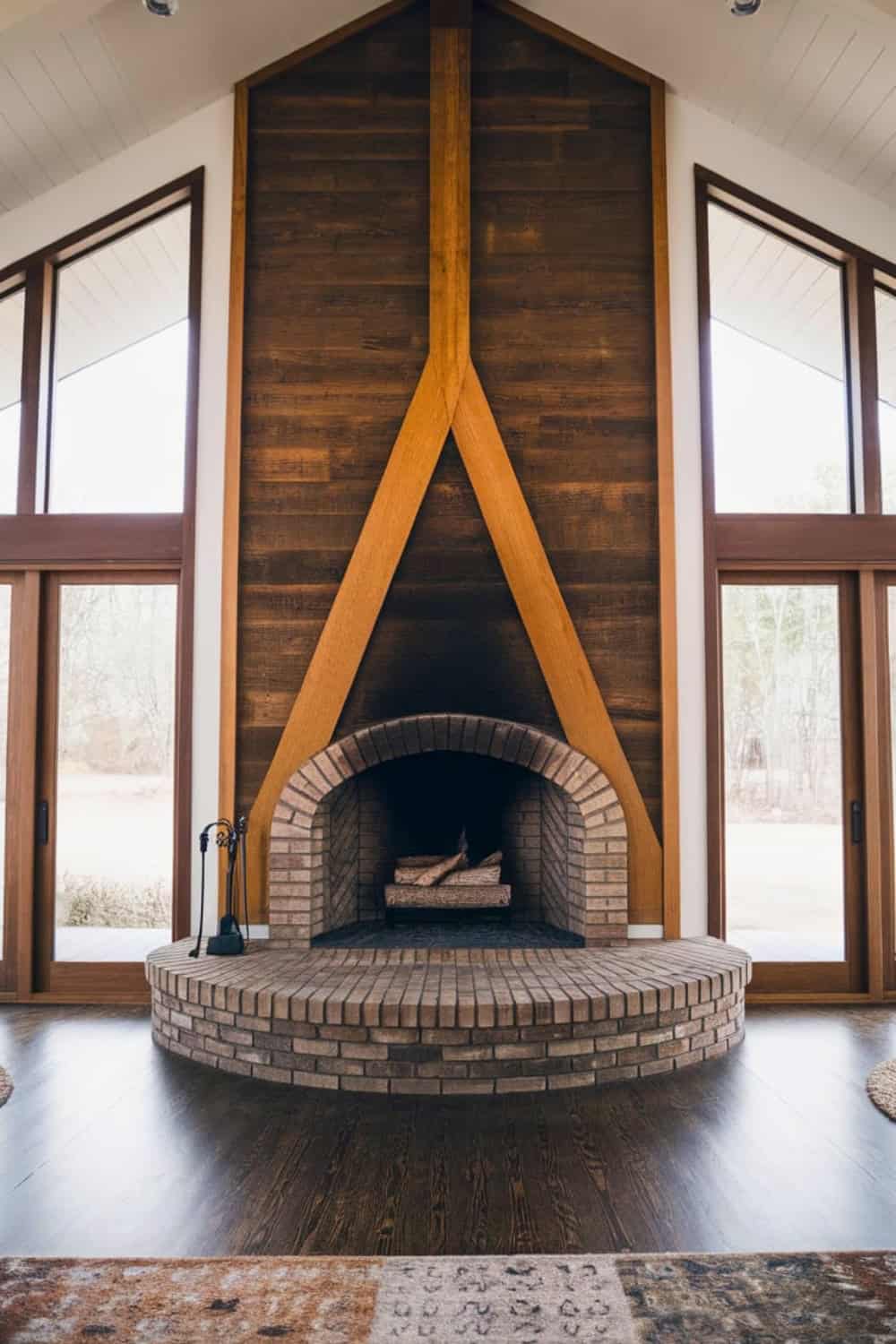 This towering brick fireplace, framed by sharp angular wood beams, brings such a classic A frame silhouette into a modern living space. The arched firebox opening gently softens those geometric lines.