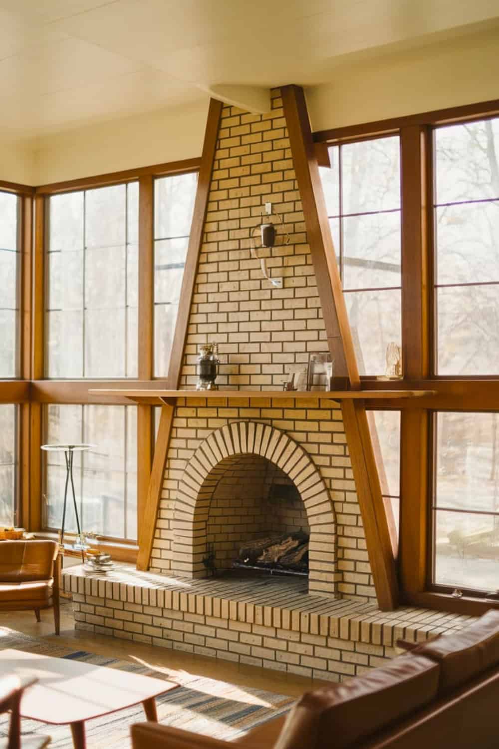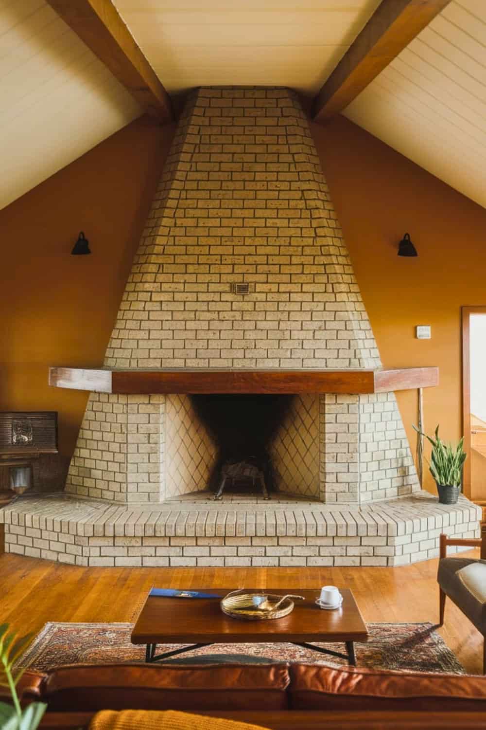 A brick fireplace shaped like a pyramid makes a truly bold midcentury statement. Its tiered brick base adds such wonderful depth.