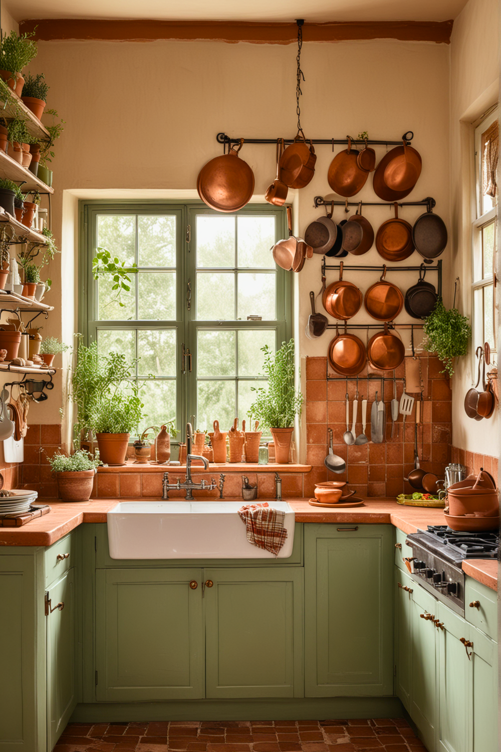 Choosing sage green and terracotta for your kitchen immediately brings a feeling of natural warmth. Your sage green cabinets offer a fresh, welcoming touch, perfectly mingling with the earthy hues of terracotta floor tiles.