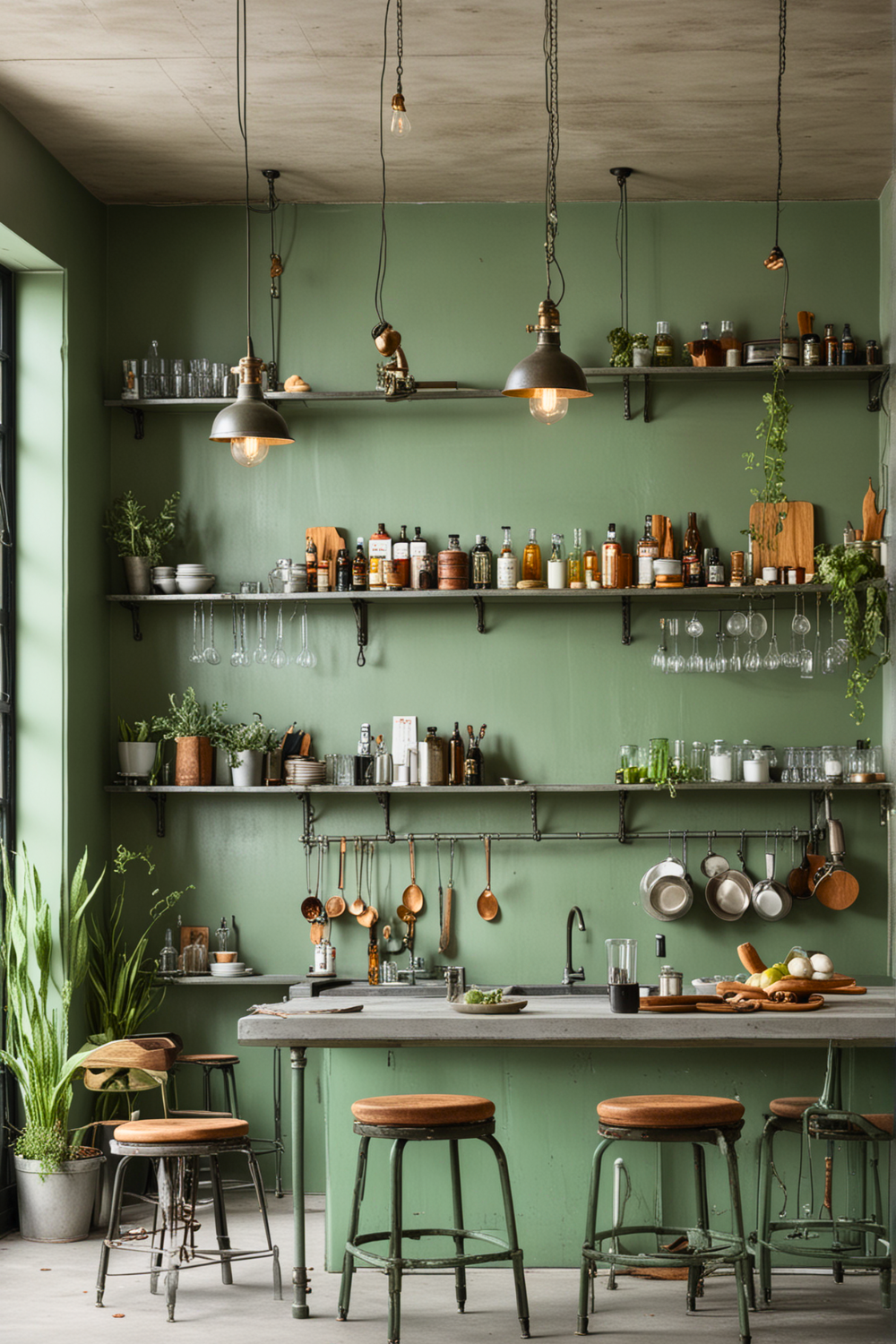 To achieve this look, start by incorporating sage green cabinetry or backsplash tiles. The softness of the green balances the raw feel of industrial features, such as exposed pipes, metal shelving, and concrete floors.
