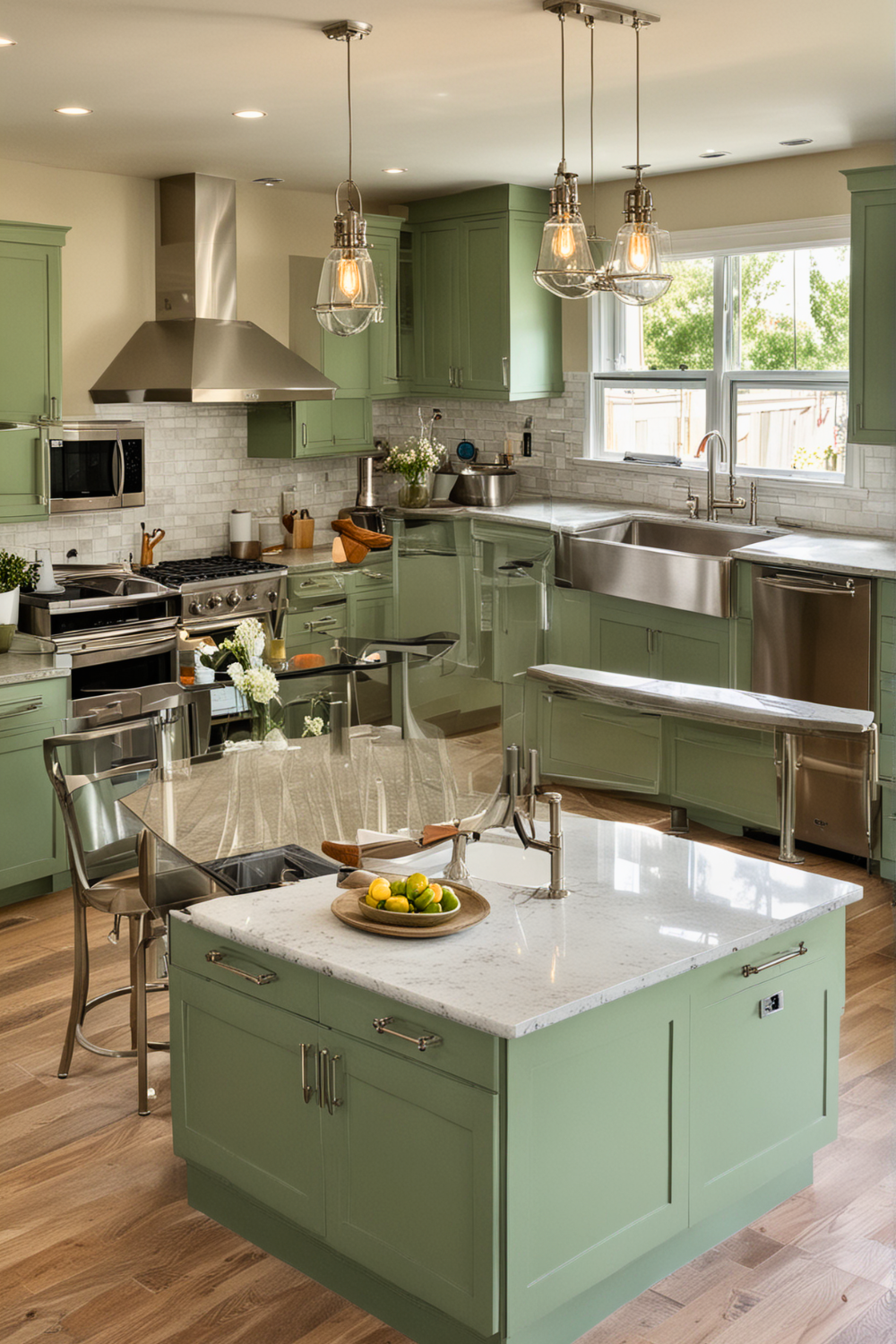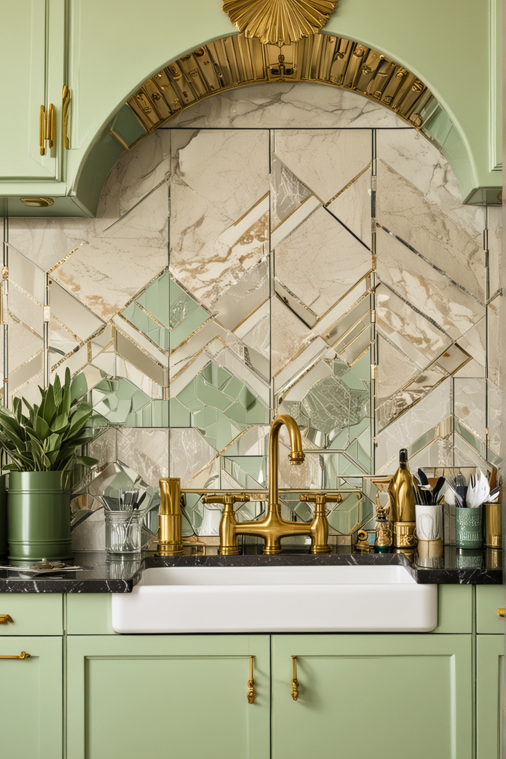 Using Art Deco elements in a sage green themed kitchen is a brilliant idea for adding a touch of glamour and sophistication. The geometric patterns typical of Art Deco, when combined with sage green, create a fresh yet timeless aesthetic.