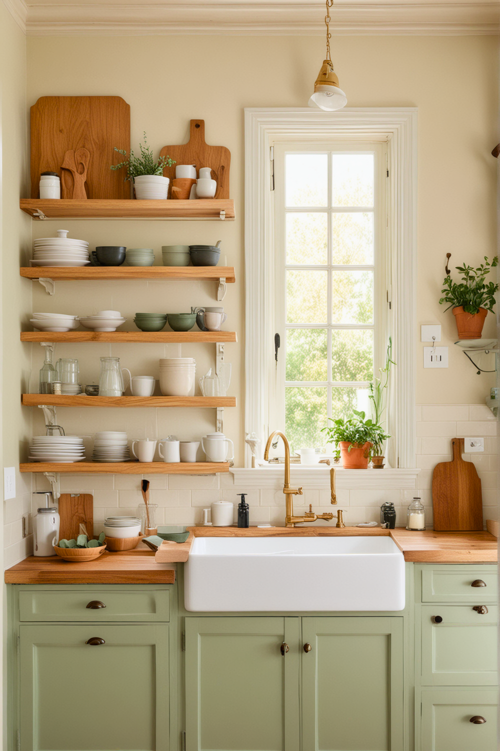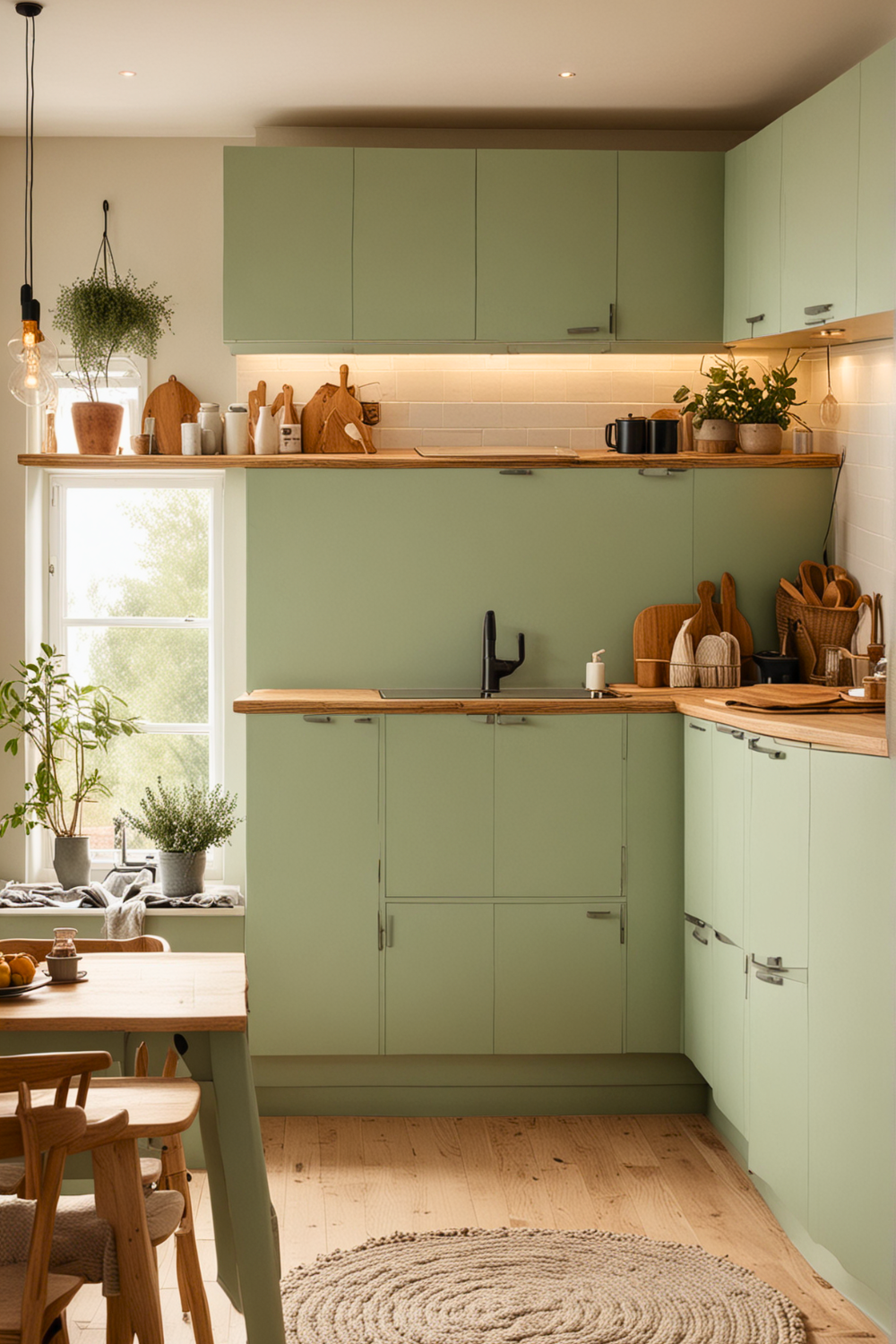 To achieve this look, start by choosing sage green cabinetry. This color makes your kitchen feel light and inviting.