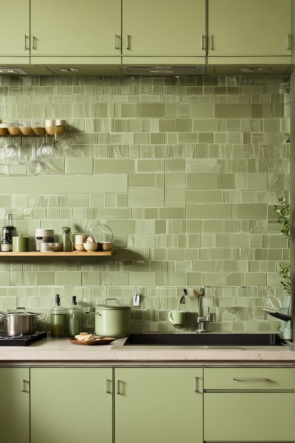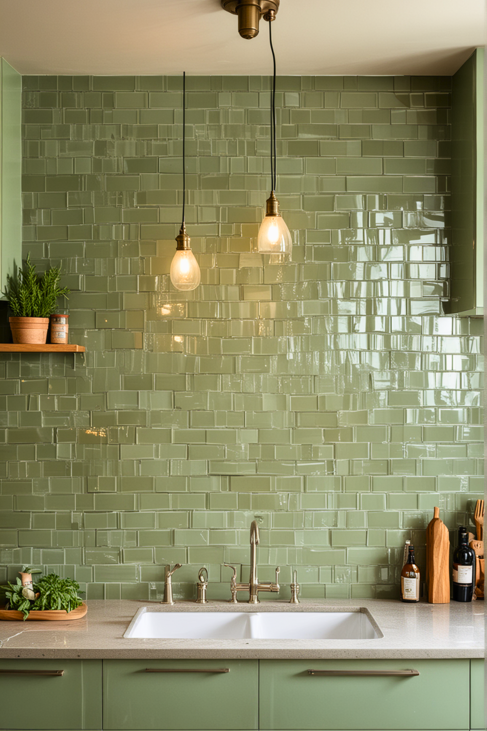 Sage green glazed tiles can transform your kitchen with their subtle charm and practical advantages. This idea works well because the glazed finish adds a glossy touch that boosts the brightness of the space, making even smaller kitchens feel more open and inviting.