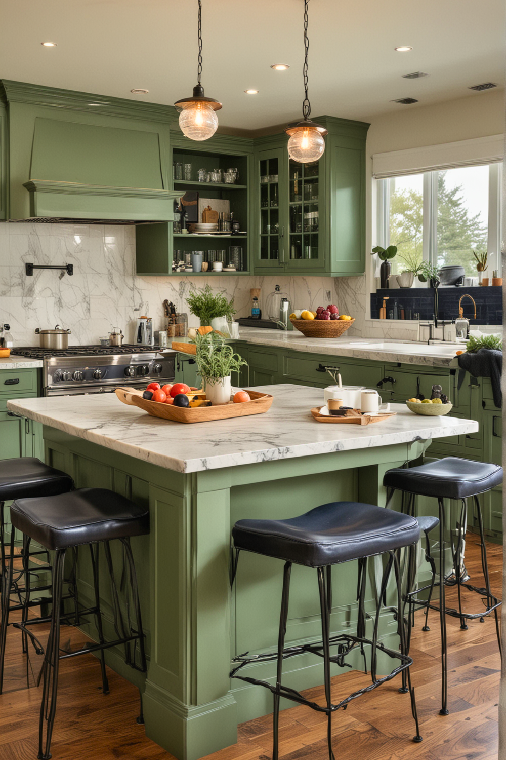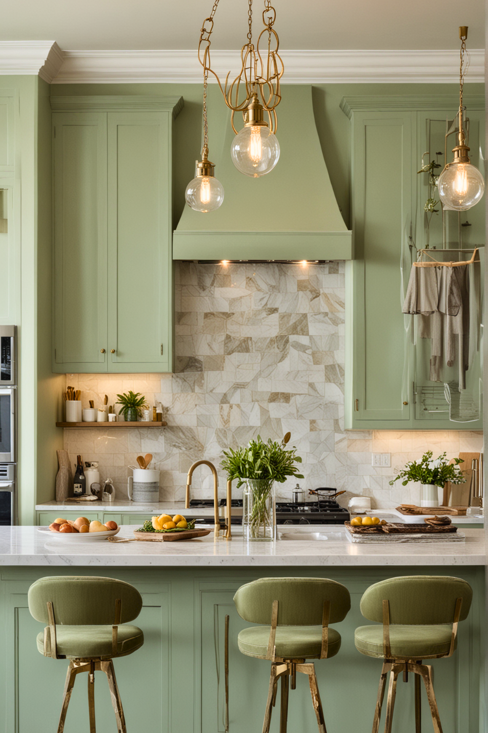To achieve this look, start by painting your cabinets sage green. Select pendant lights with a soft glow and place a few plush chairs or stools near a central island or dining table.