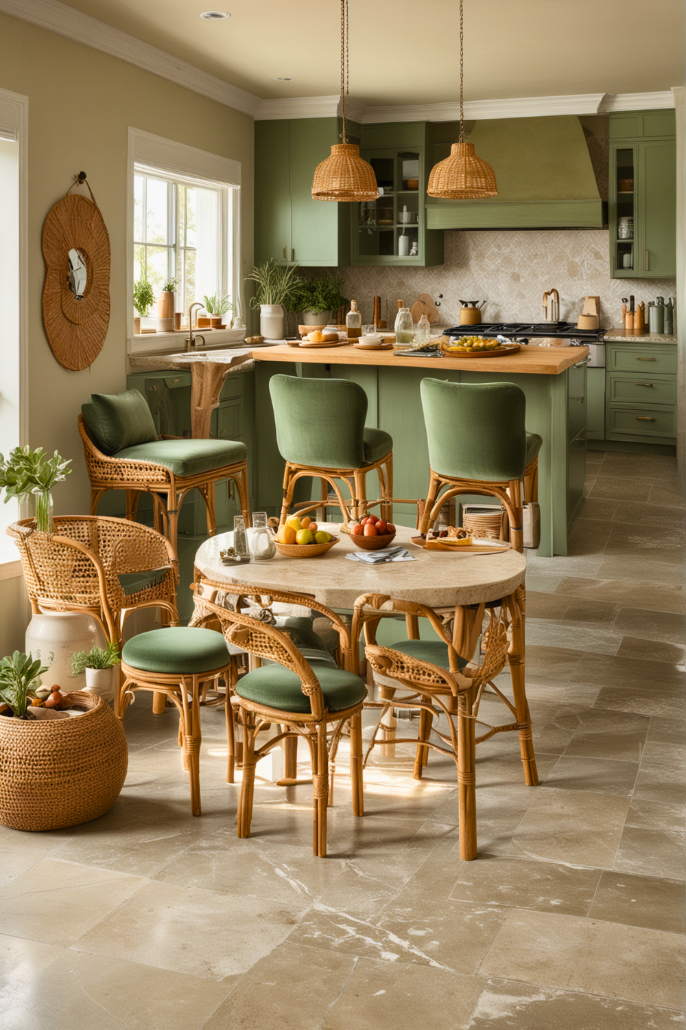 The idea is simple: sage green velvet adds a touch of luxury and softness, perfect for a cozy breakfast nook. Rattan chairs bring a natural, earthy vibe that contrasts beautifully with the sleek, smooth stone countertops.