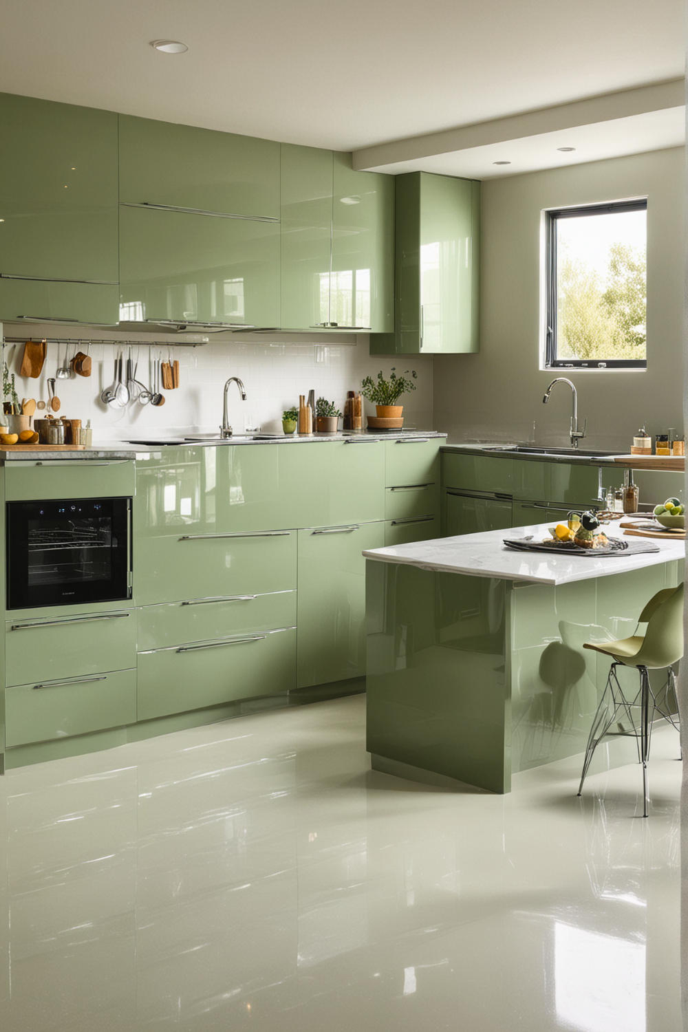 Choosing a minimalist sage green kitchen transforms your cooking area into a serene, uncluttered sanctuary. The sage green color introduces a natural, calming atmosphere, making the kitchen a place where you can relax while preparing meals.