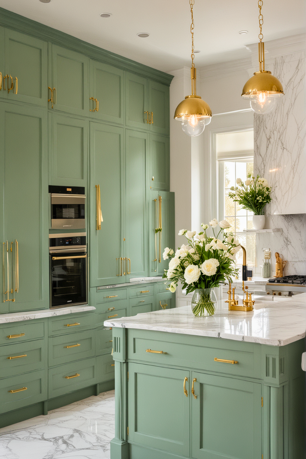 Incorporate sage green cabinetry or walls as the primary color. Add brass fixtures, such as handles or faucets, for a touch of luxury.