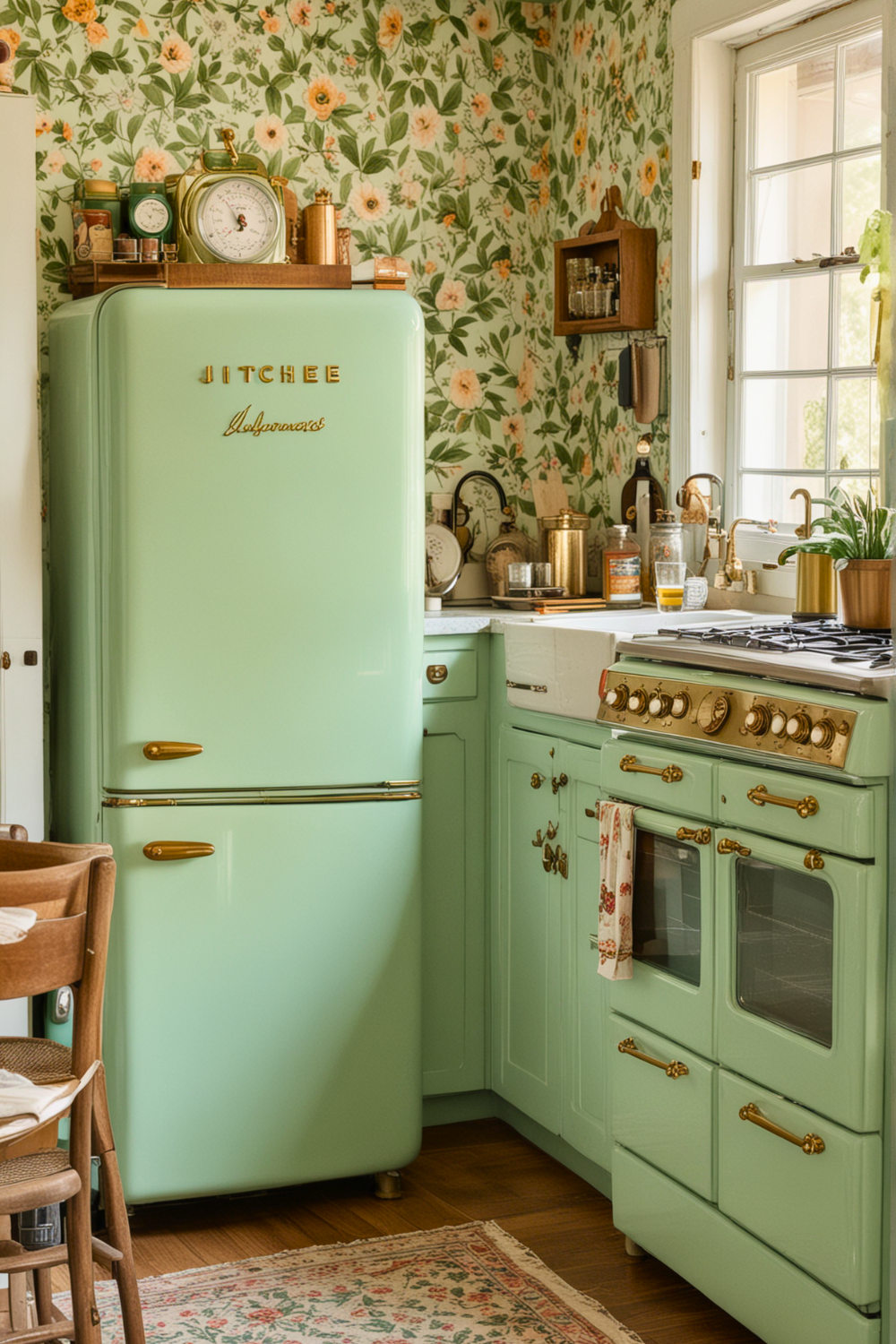 Sage green cabinets provide a calm, earthy base that pairs wonderfully with retro touches like antique brass fixtures and vintage inspired appliances. The combination of old and new creates a balanced contrast that makes the kitchen warm and welcoming.