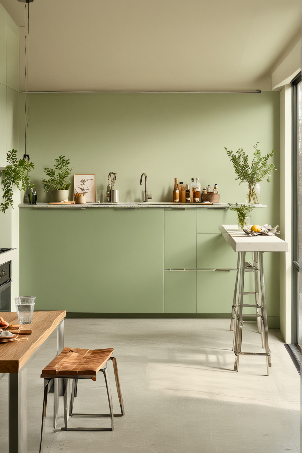 Pair this with rattan chairs to introduce a rustic element. Finally, choose stone countertops that complement the sage green hue while providing a sleek, modern touch.