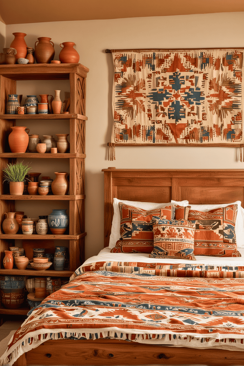Decorative pottery is a wonderful way to fill your bedroom with the lively spirit of the Southwest. This idea works well because these pottery items bring warmth, culture, and a touch of color into any area. They are typically adorned with strong colors and intricate patterns that reflect the region’s artistic legacy.