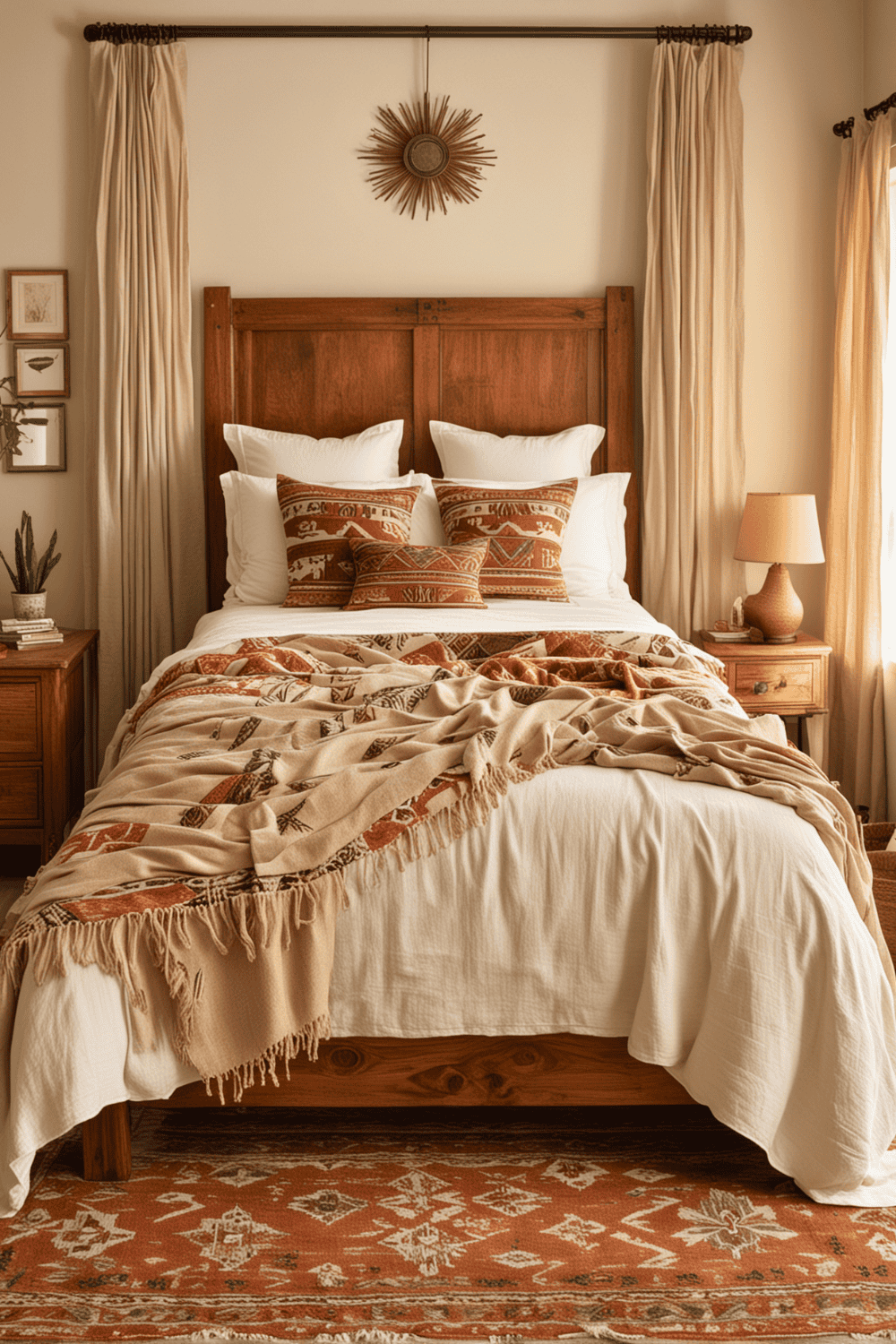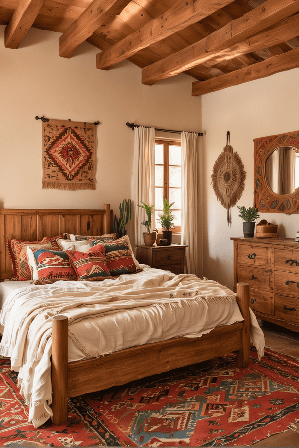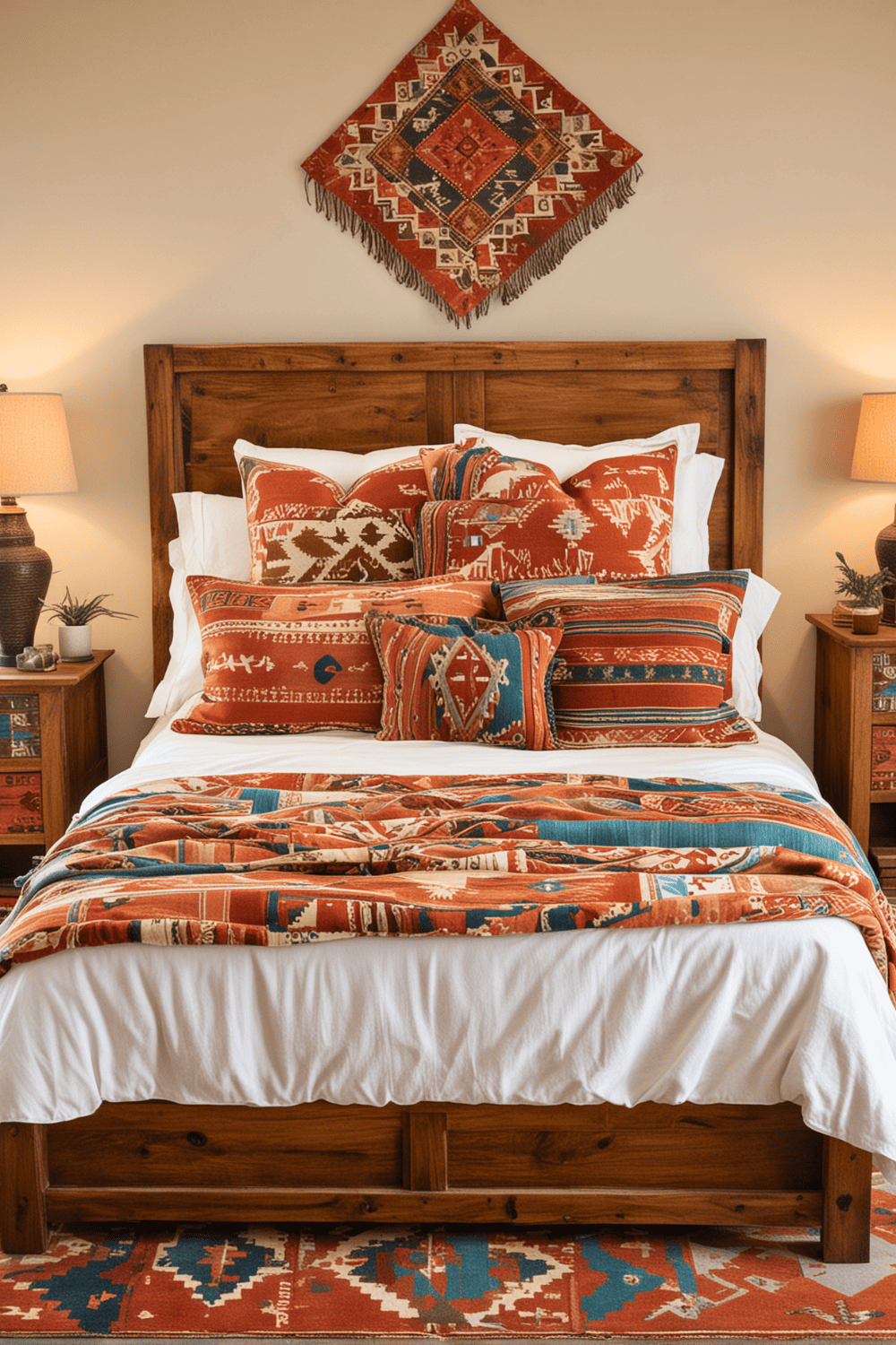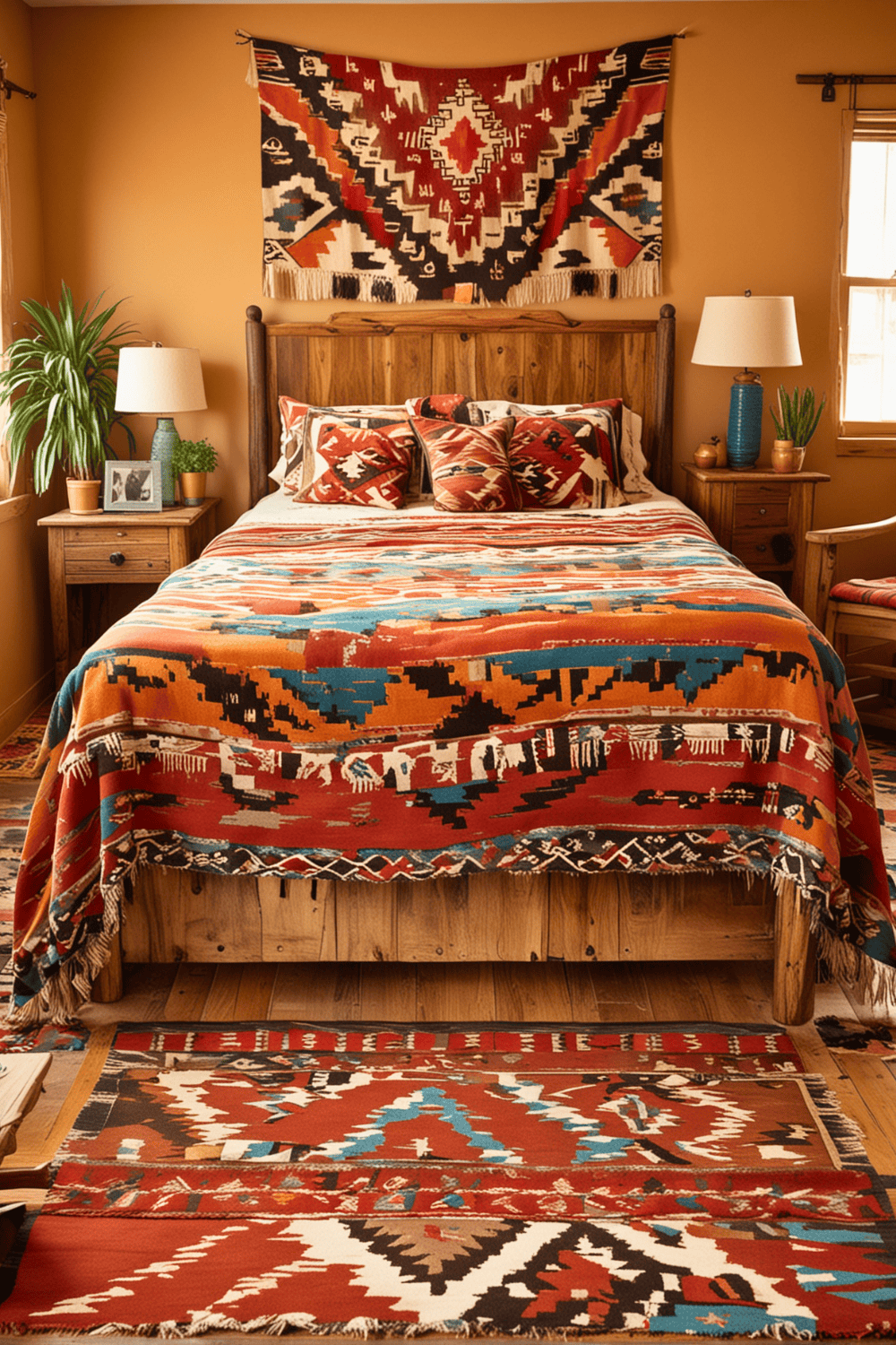 For added texture and warmth, introduce wooden accents like bed frames, side tables, or picture frames. Complete this setup with vibrant textiles, such as Southwestern patterned rugs or quilts, to pull the entire look together. This method ensures a balanced and unified aesthetic, making your bedroom both stylish and comfortable.