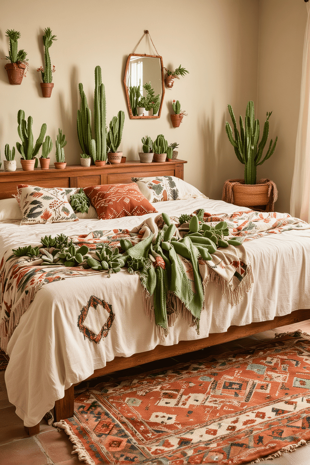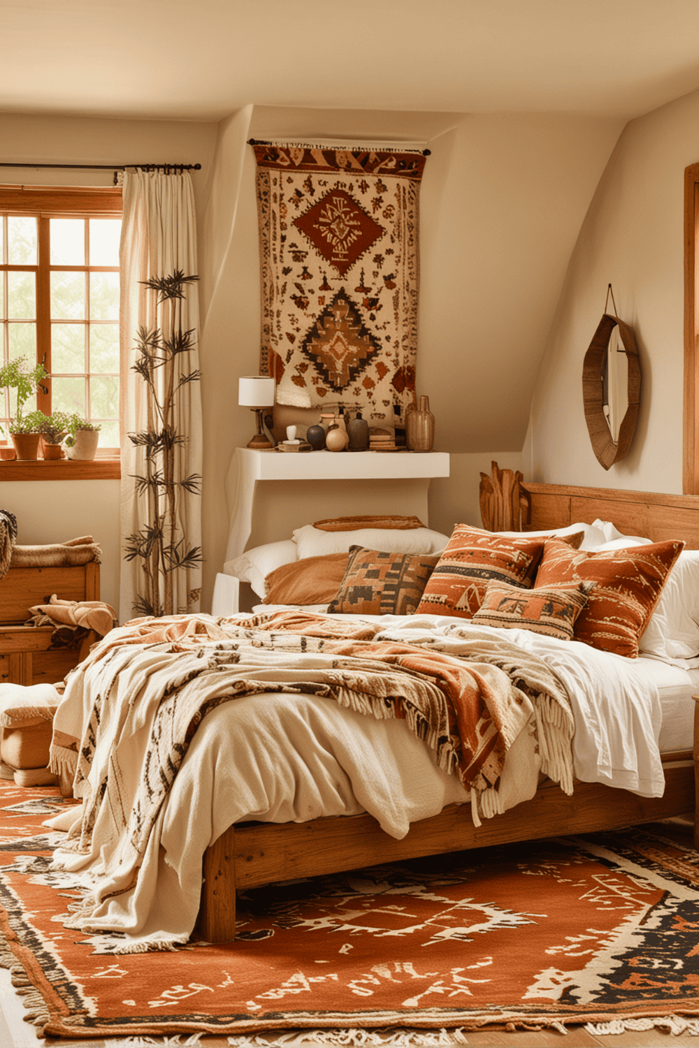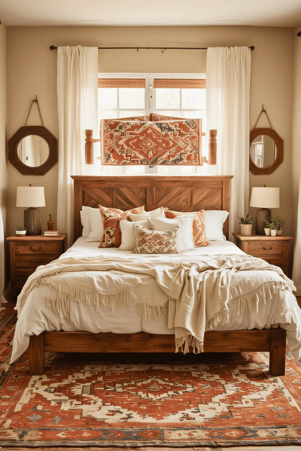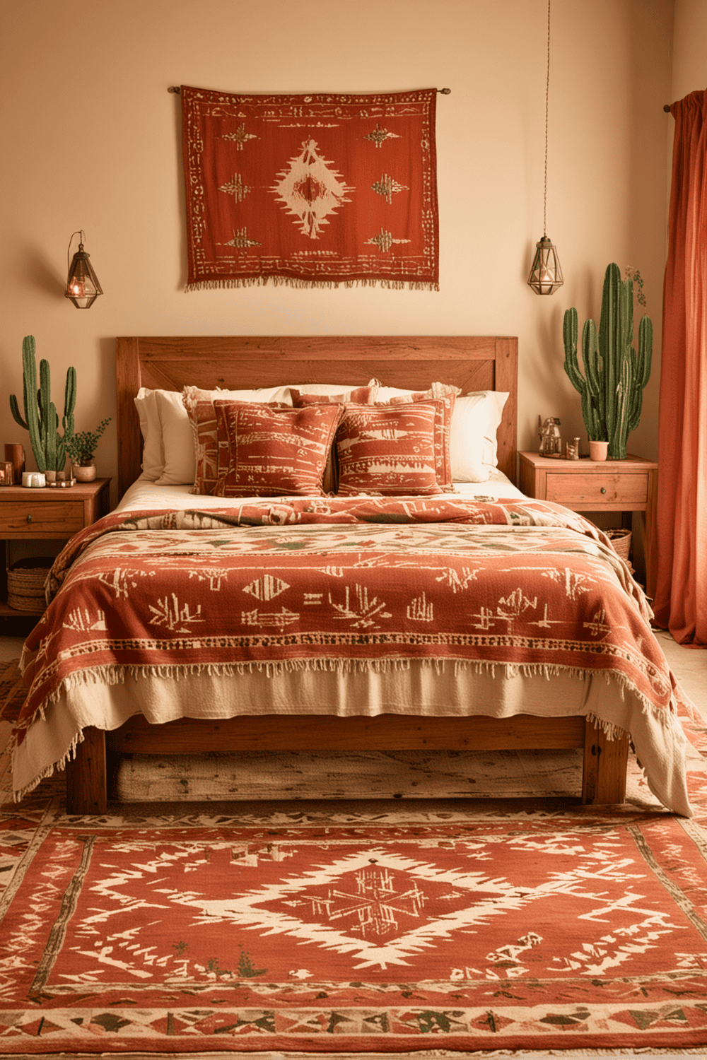 For added texture and warmth, introduce wooden accents like bed frames, side tables, or picture frames. Complete this setup with vibrant textiles, such as Southwestern patterned rugs or quilts, to pull the entire look together. This method ensures a balanced and unified aesthetic, making your bedroom both stylish and comfortable.