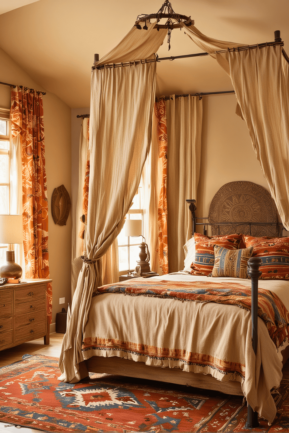Transform your bedroom into a Southwestern retreat by adding a canopy bed with striking drapes. This design choice isn’t just about bedding; it’s about creating a strong focal point that brings drama and luxury to your space.