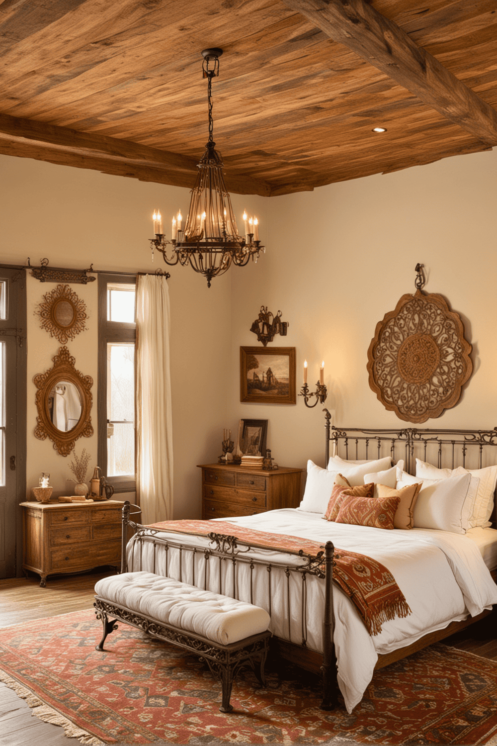 Its effectiveness is quite simple: rustic chandeliers combine enduring craftsmanship with modern functionality. Their soft ambient lighting provides a welcoming glow, making your bedroom feel elegant without losing that homely touch.