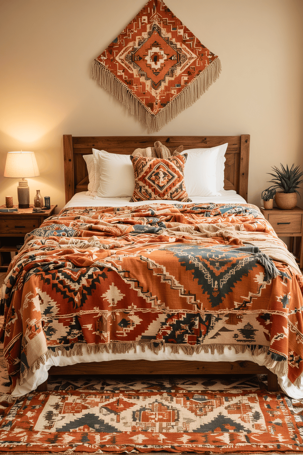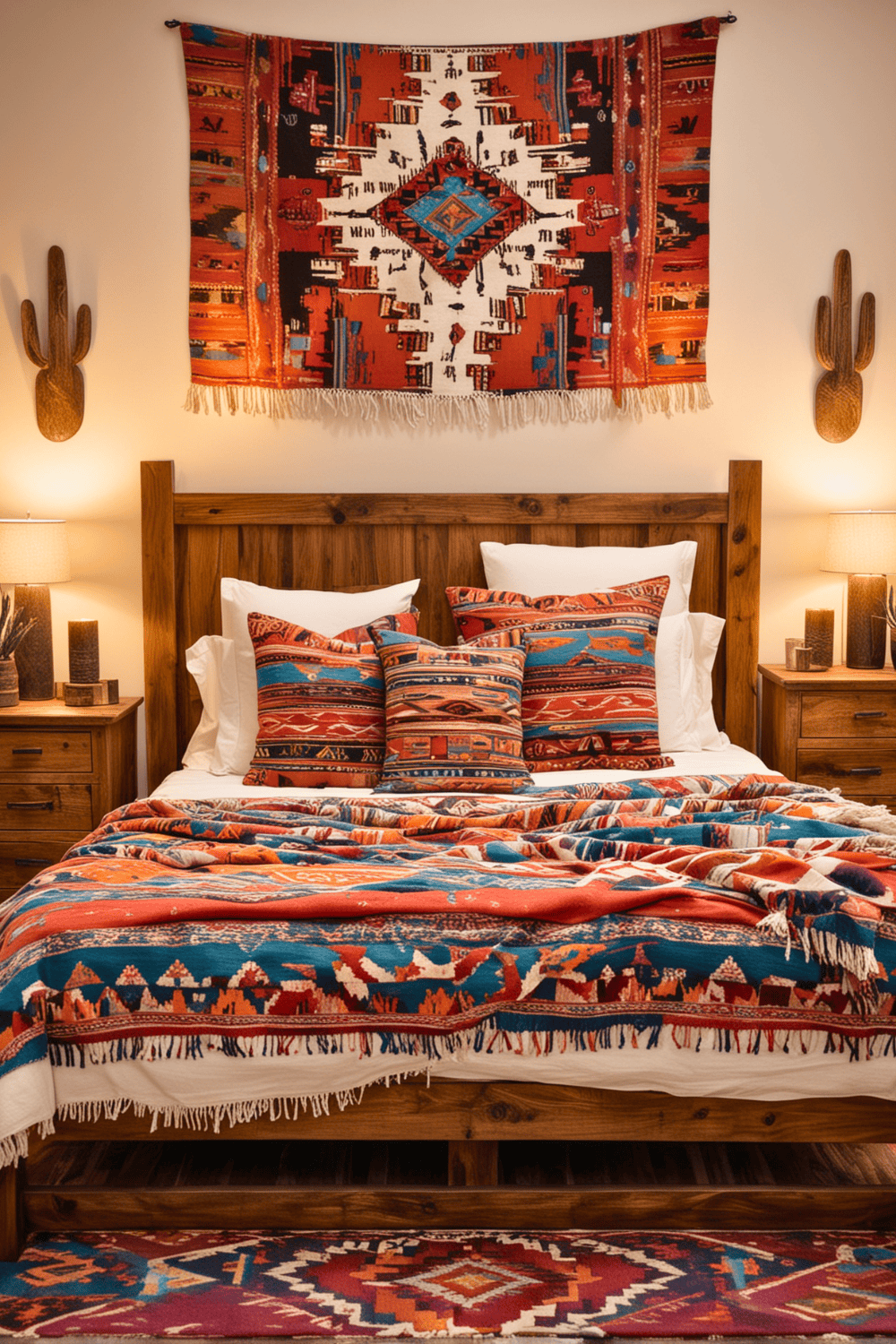 Southwestern textile pieces truly breathe life into a drab space. Their intricate artistry makes for great conversation starters and can make your bedroom feel more welcoming and comfortable. To incorporate this, draping a colorful blanket over your bed is a simple first step.
