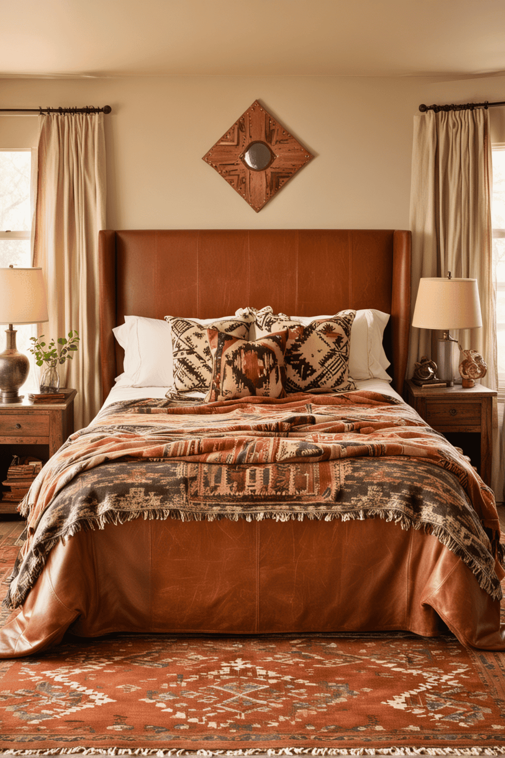 Bringing leather furniture into your bedroom is a total game changer for adding a touch of natural sophistication and rustic charm. Leather’s texture and inherent warmth blend seamlessly with the Southwestern theme, providing both luxury and a grounded sensation. Just consider the visual and tactile appeal of a leather headboard; it’s not only stylish but also durable and classic.
