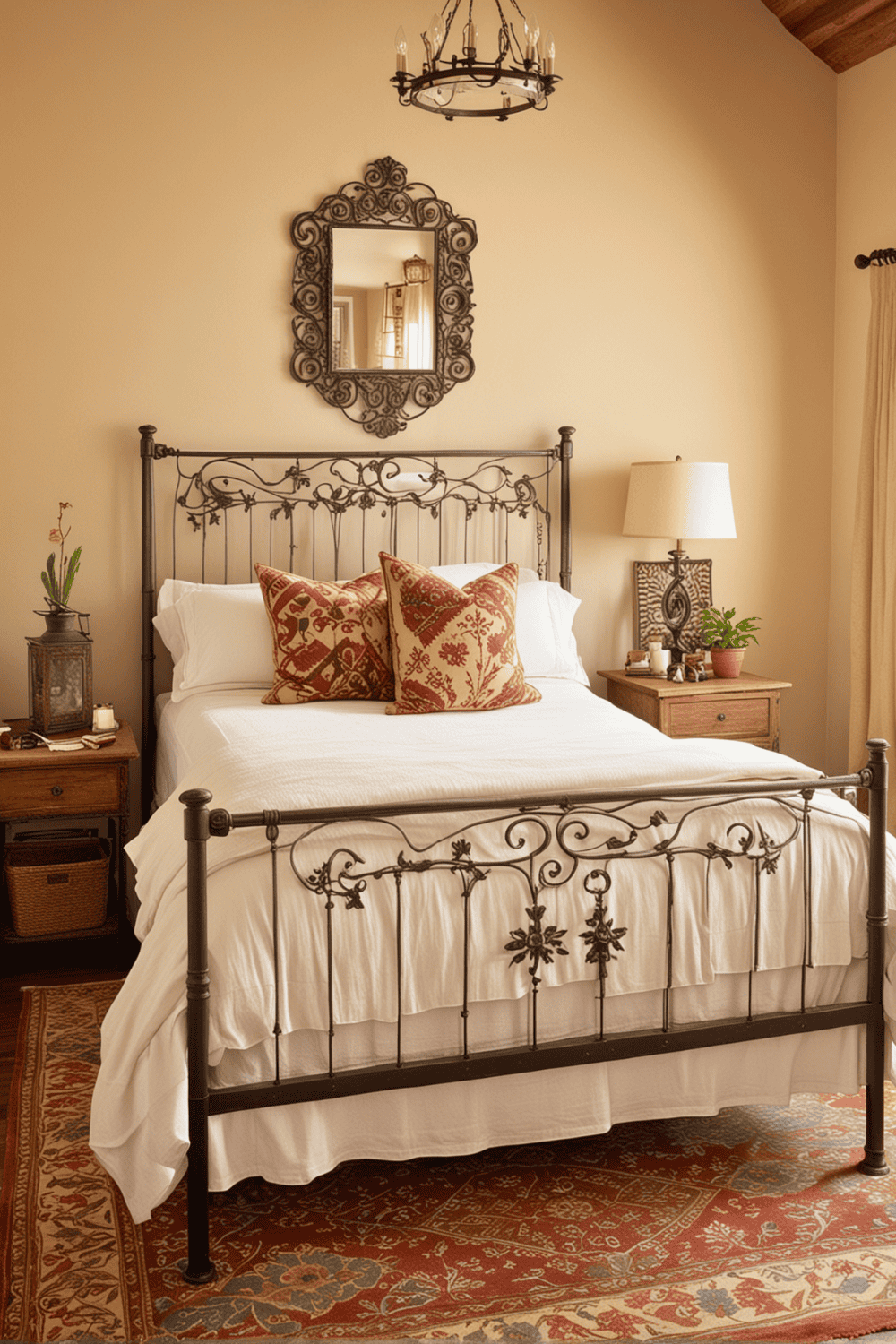 Adding wrought iron touches to your bedroom can bring a special mix of strength and old world charm. This idea works wonderfully because wrought iron items are both practical and decorative, enhancing the room’s character without making it feel cluttered. The timeless appeal of wrought iron fits perfectly within the Southwestern style, known for its earthy tones and rustic elements.