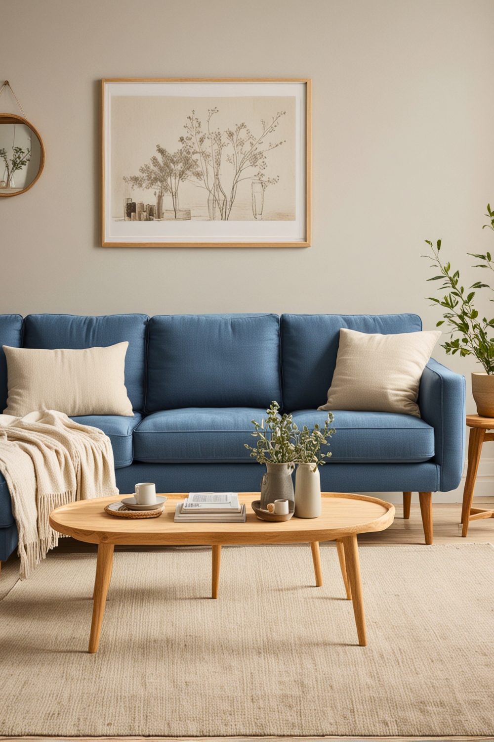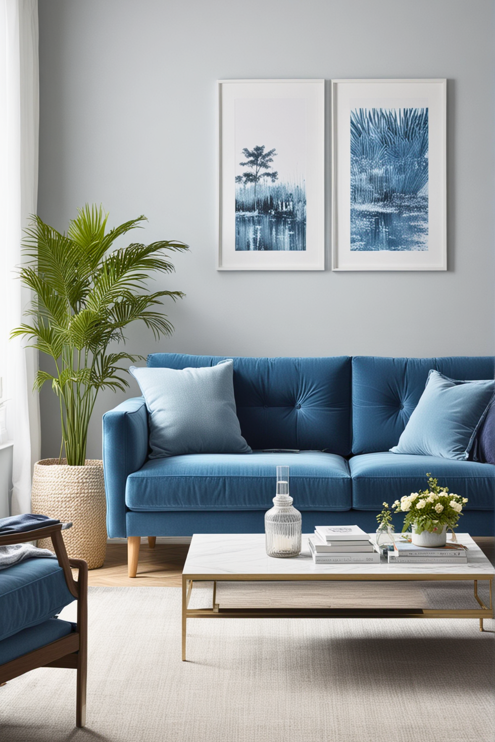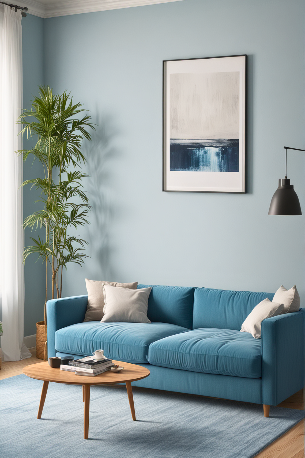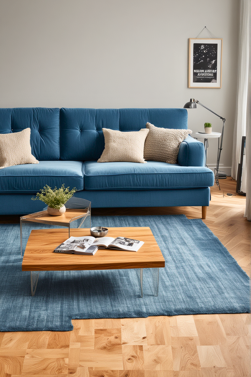 To achieve this style, start with a neutral color scheme, highlighting whites, grays, and gentle pastels. Place your blue couch as a central point, making sure it blends with the surrounding shades.