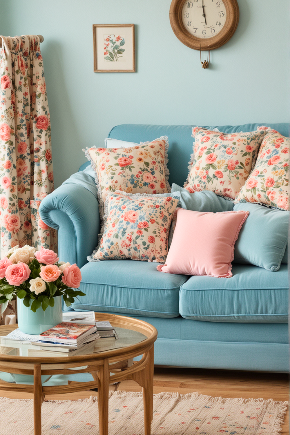 To achieve this look, start by choosing a blue couch as the central item. Introduce floral prints through cushions, window coverings, or rugs to add visual interest.