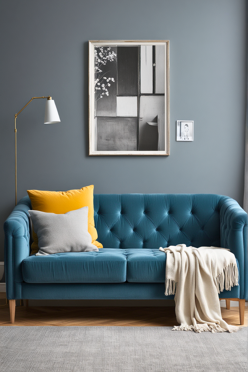 Painting the walls in strong colors like mustard or deep gray can utterly transform a living space. It generates a bold difference that makes key furniture items, such as a blue couch, truly stand out.