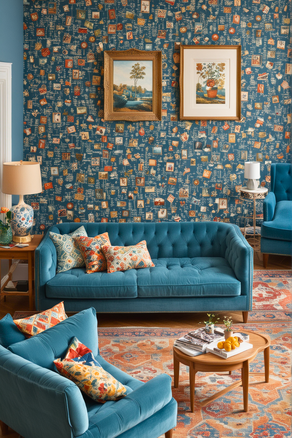 Turn your living room into a cheerful, classic sanctuary by blending retro furniture and patterns with a fashionable blue couch. A retro theme adds a distinct, sentimental allure, making your space inviting and full of character.