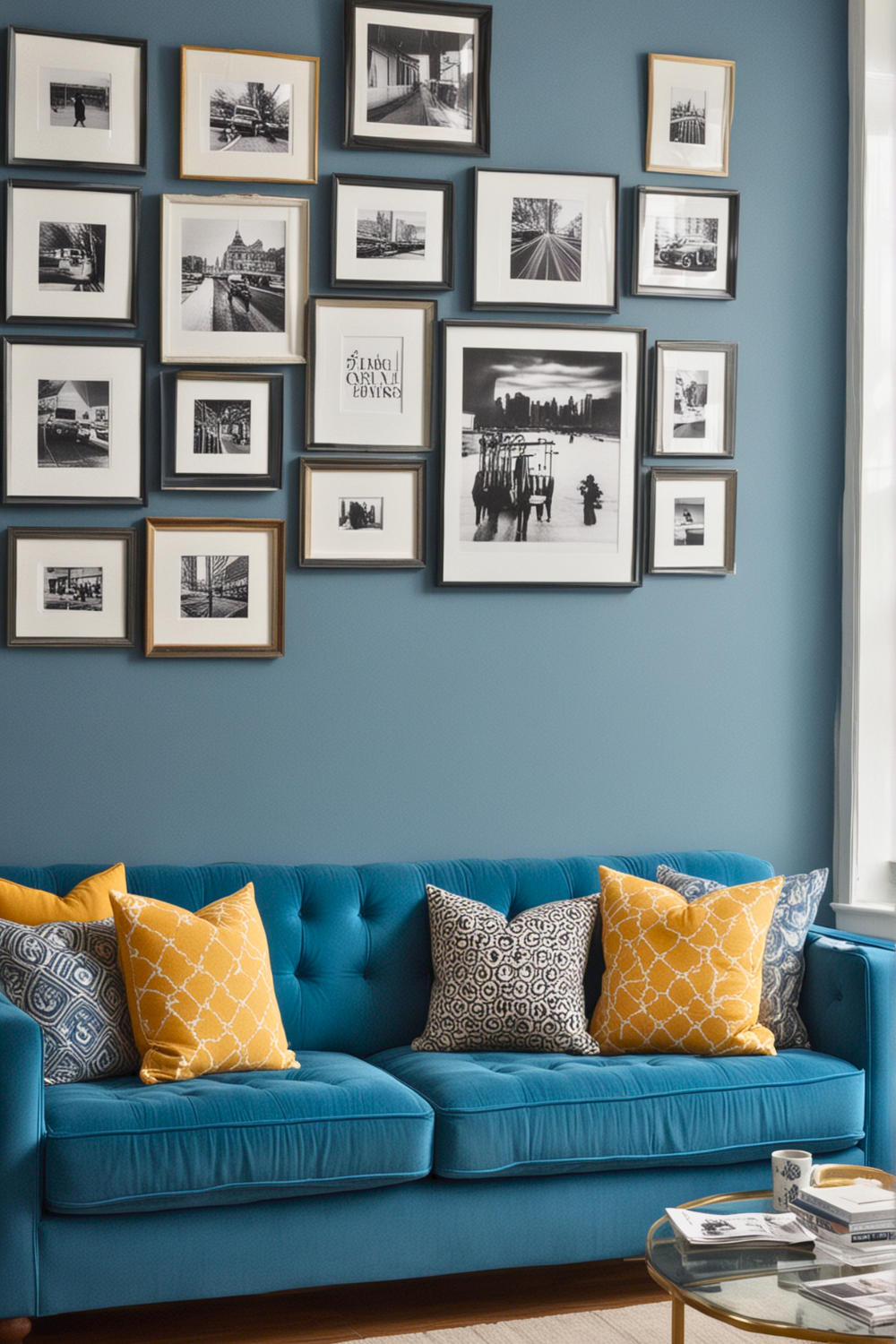 To achieve this impact, begin by choosing a few attention grabbing art pieces that work well with the blue tone of your couch. Consider bold, contrasting shades like yellow, red, or teal.