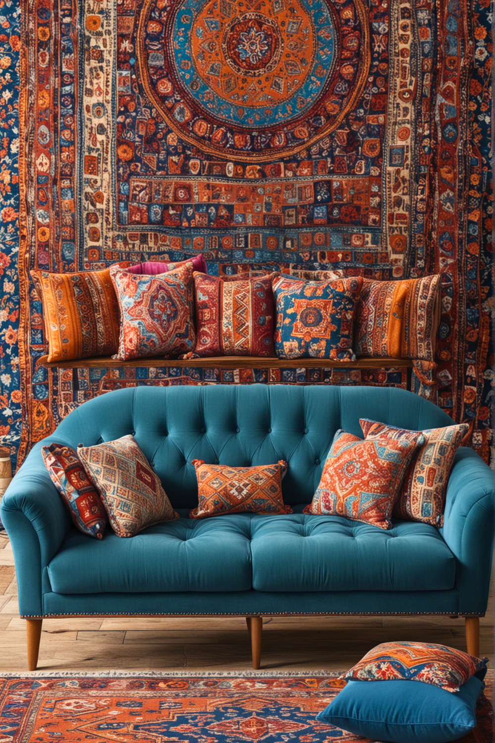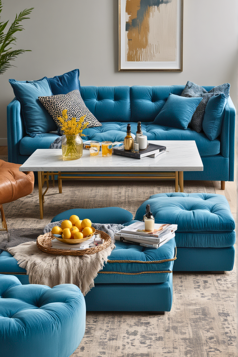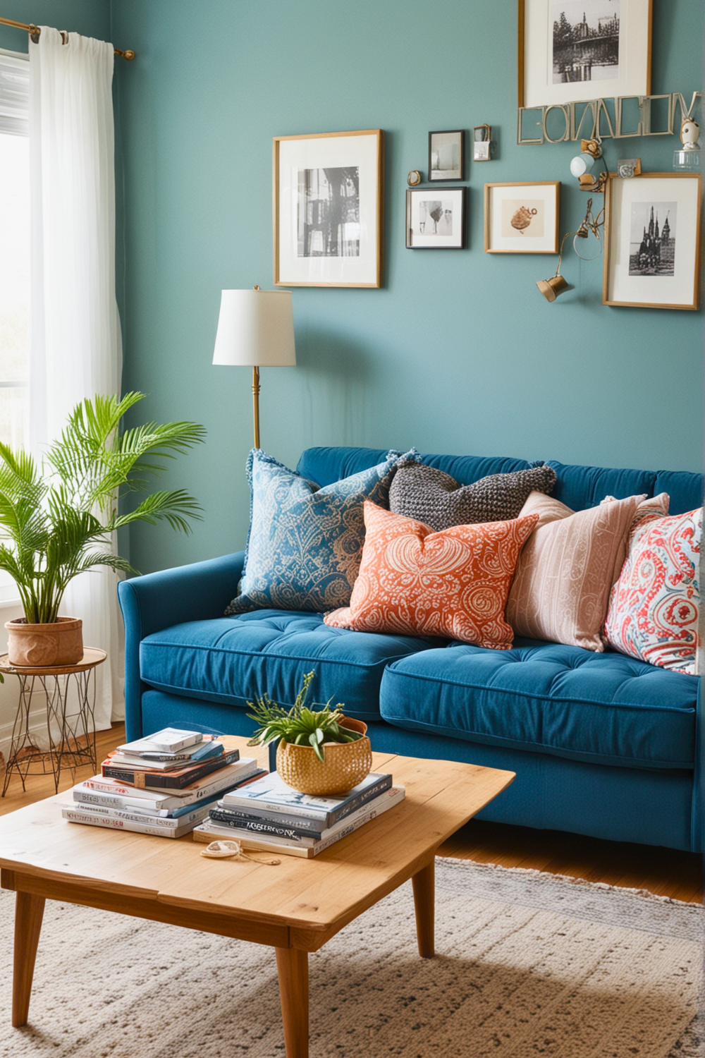 At the same time, the prominent blue couch acts as a striking element, adding character and vibrancy. The approach to achieving this style is straightforward.