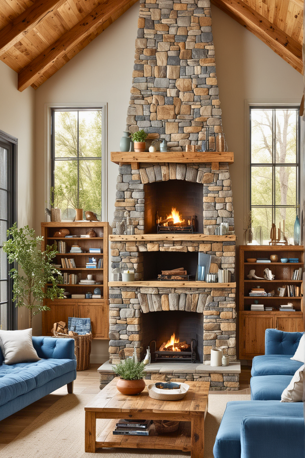 Creating an area with rustic charm can significantly boost your home’s coziness and inviting feel. Organic wood elements and a stone fireplace surrounding the blue couch establish a connection with nature, offering solidity and enduring beauty.