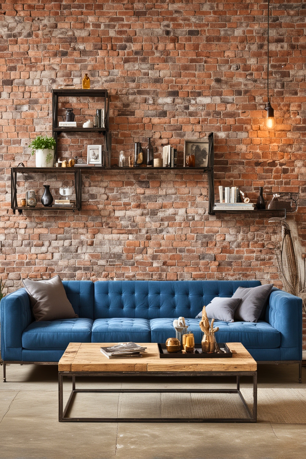 Uncover a brick wall or add metal shelving to give the room a robust background. Position a refined blue couch to contrast with these strong elements.