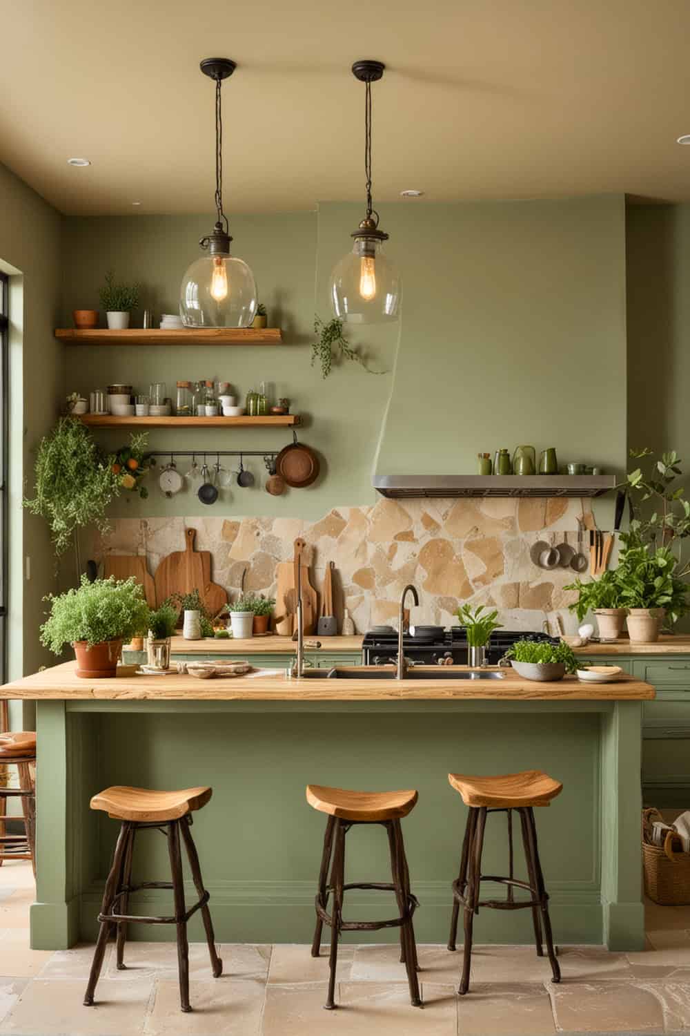 To achieve this style, start by choosing sage green for your cabinets or walls. You could also introduce it with smaller changes, perhaps a kitchen island or decorative items like backsplash tiles or accessories.