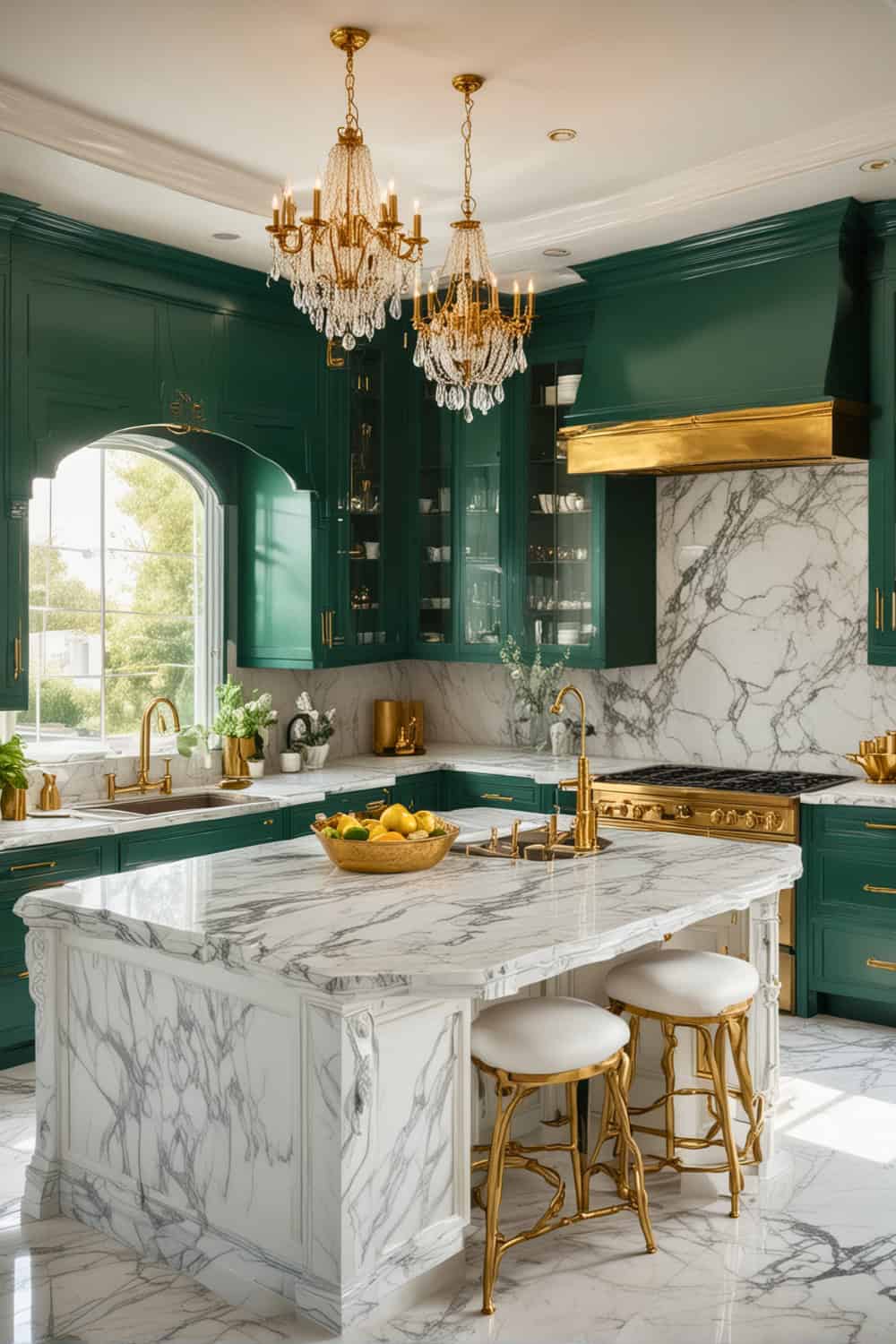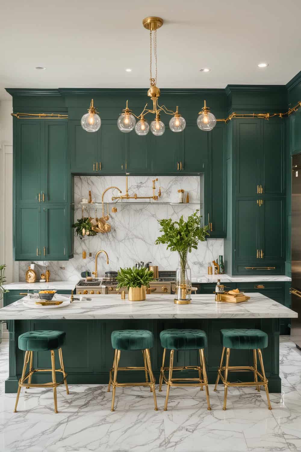 To get this look, consider painting your cabinets or walls in emerald green. Add gold or brass handles and light fixtures to amplify the luxurious feeling.