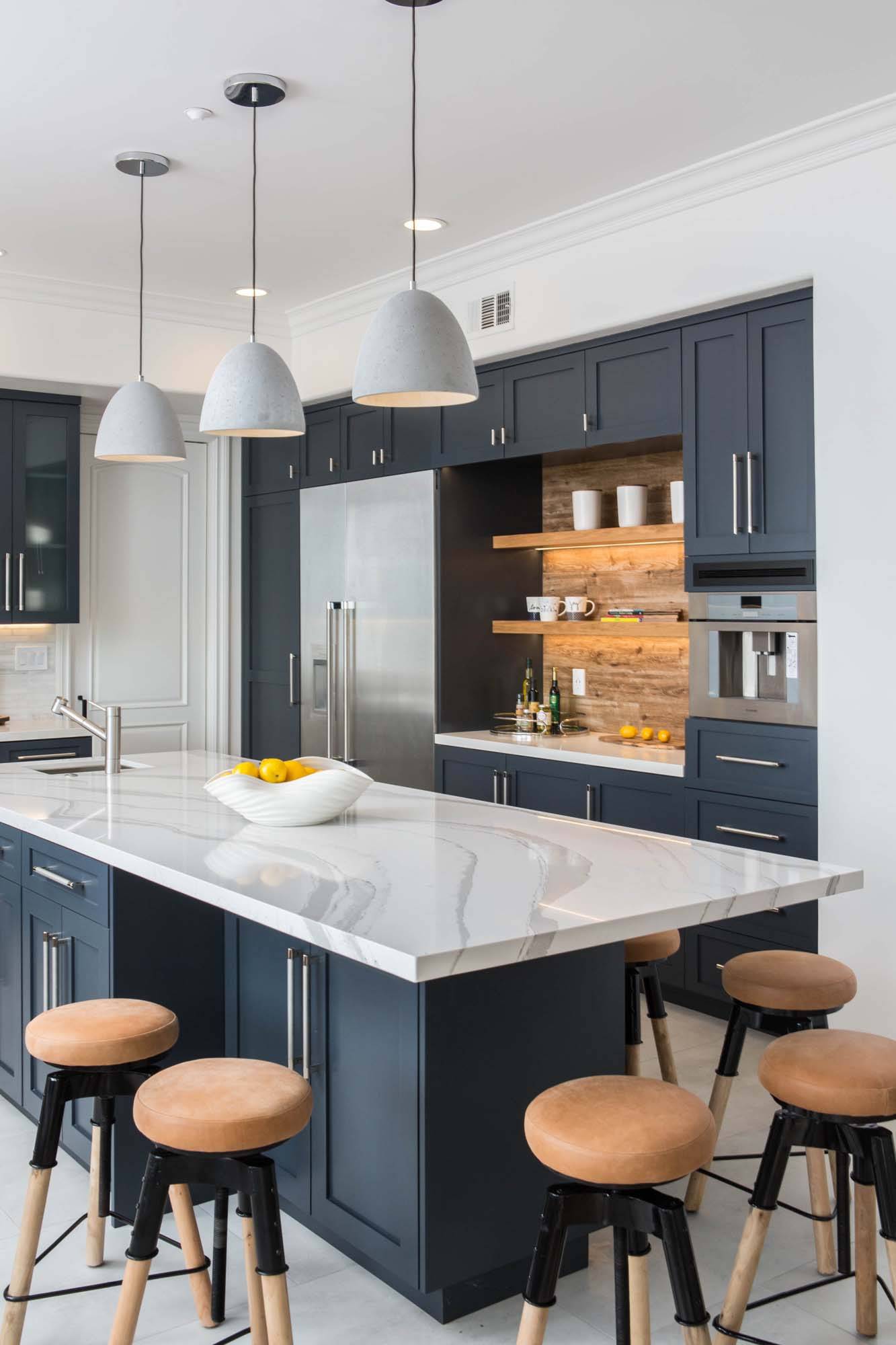 To really complement the trend of dark cabinetry, white countertops are the perfect partner. The whole point is to create a bold contrast that absolutely makes a statement.
